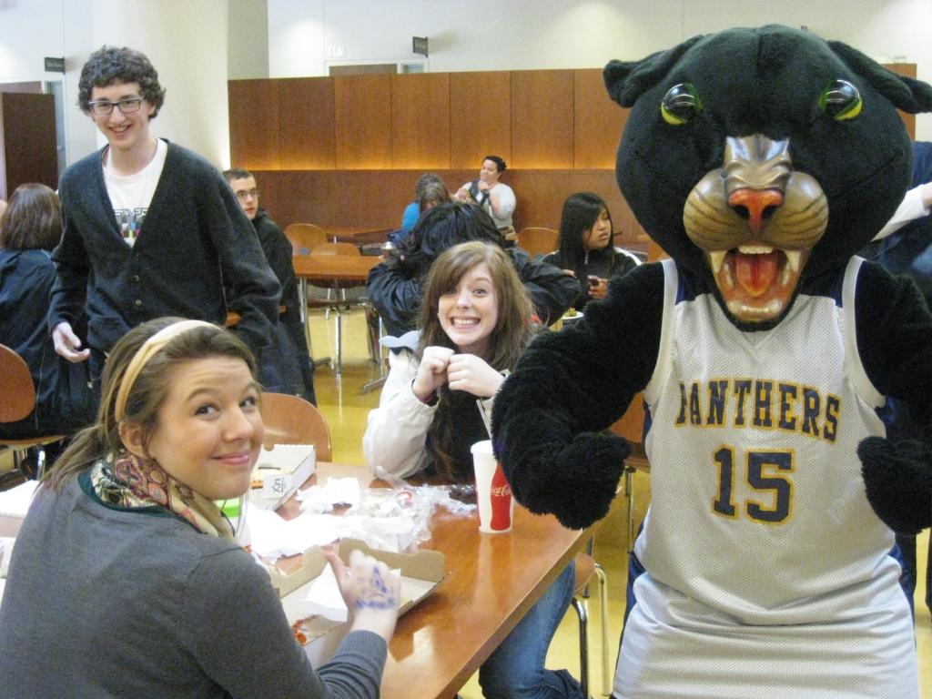 Students from Sherwood High School hang out with Poppe the Panther – PCC’s mascot – at the Sylvania Campus cafeteria for the campus Preview Day on April 2. The day serves as an on-campus opportunity for local high school students to investigate possible majors at the college. This year’s Preview Day attracted more than 300 students. It has been held at Rock Creek and Cascade campuses as well. For more information on the PCC Panther, check him out on Facebook (http://www.facebook.com/PCCPanther).