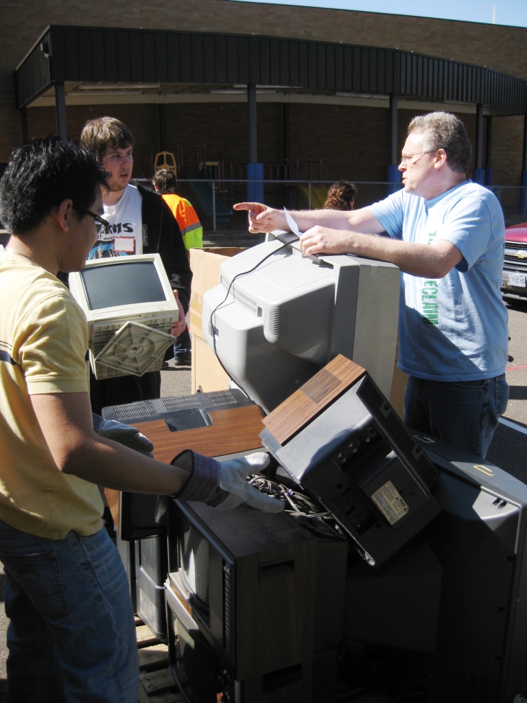 Don Hawkins of Total Reclaim gives directions to PCC Sylvania students about how to triage and sort donated computer items and television sets for the college’s e-Cycling drive as part of the annual spring cleanup recycling event. Nearly 80 volunteers of students, staff and faculty took part in the annual event. More than 1,198 items, tipping the scale at 26,842 pounds, or 13.42 tons, were collected.