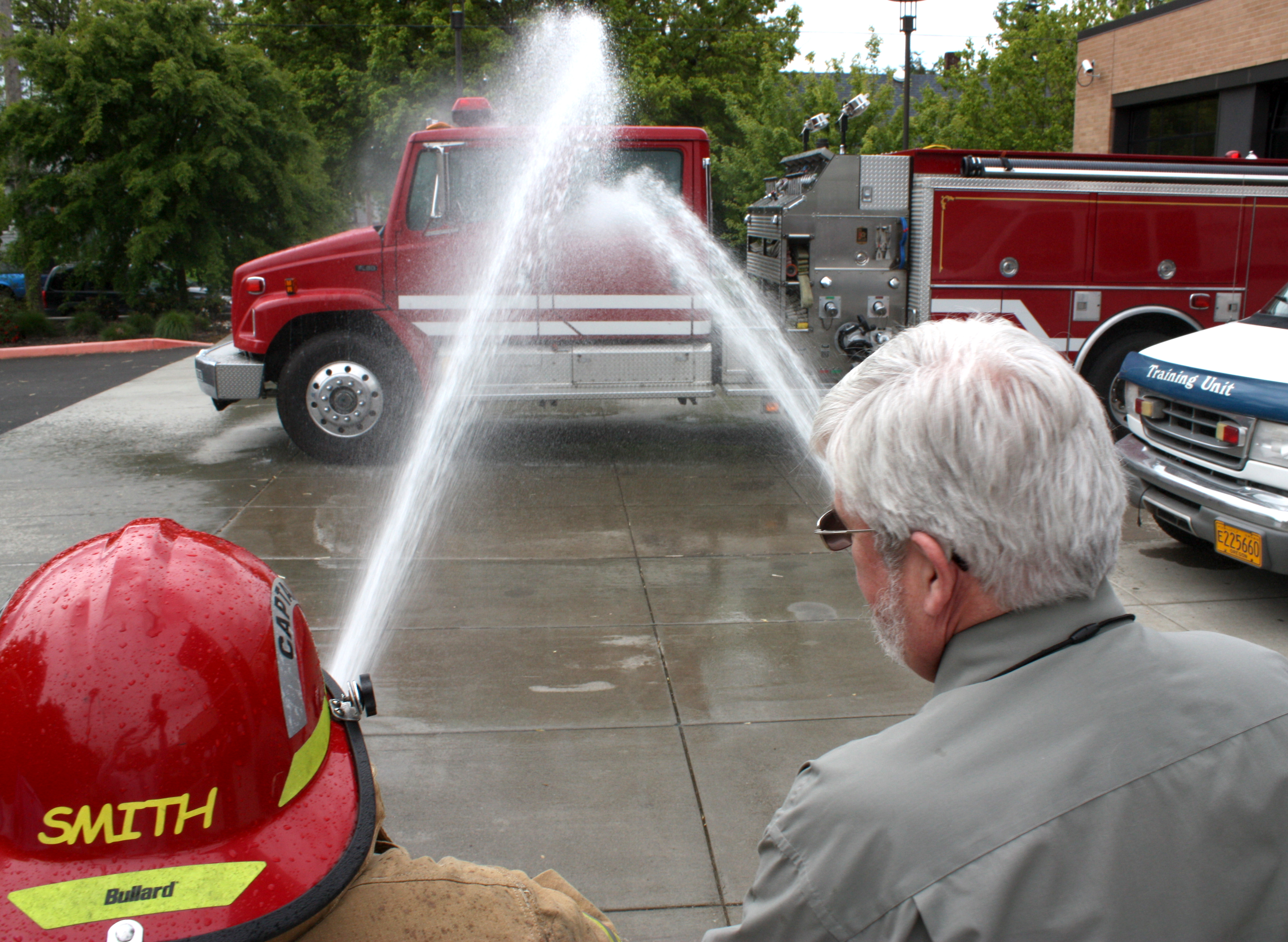 A Fire Science student uses an axe to break the windows of the car used in a mock drunken driving drill. Students will extricate “victims” (actually volunteers from Scappoose High School) from a wrecked vehicle, administer immediate emergency treatment and then prepare the victims for transport to the hospital.