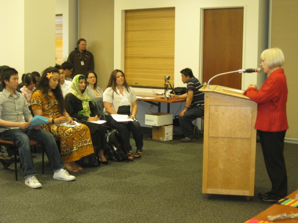 Linda Gerber, president, Sylvania Campus, speaks to attendees of this year’s Multicultural Center completion ceremony after receiving the 2010 Outstanding Ally award. The Sylvania Campus Multicultural Center celebrated its annual completion ceremony on May 20 and honored eight peer tutors and student coordinators. Additionally, Katy Ho, associate dean of Student Development, was presented with the 2010 Remarkable Professional of Color award.