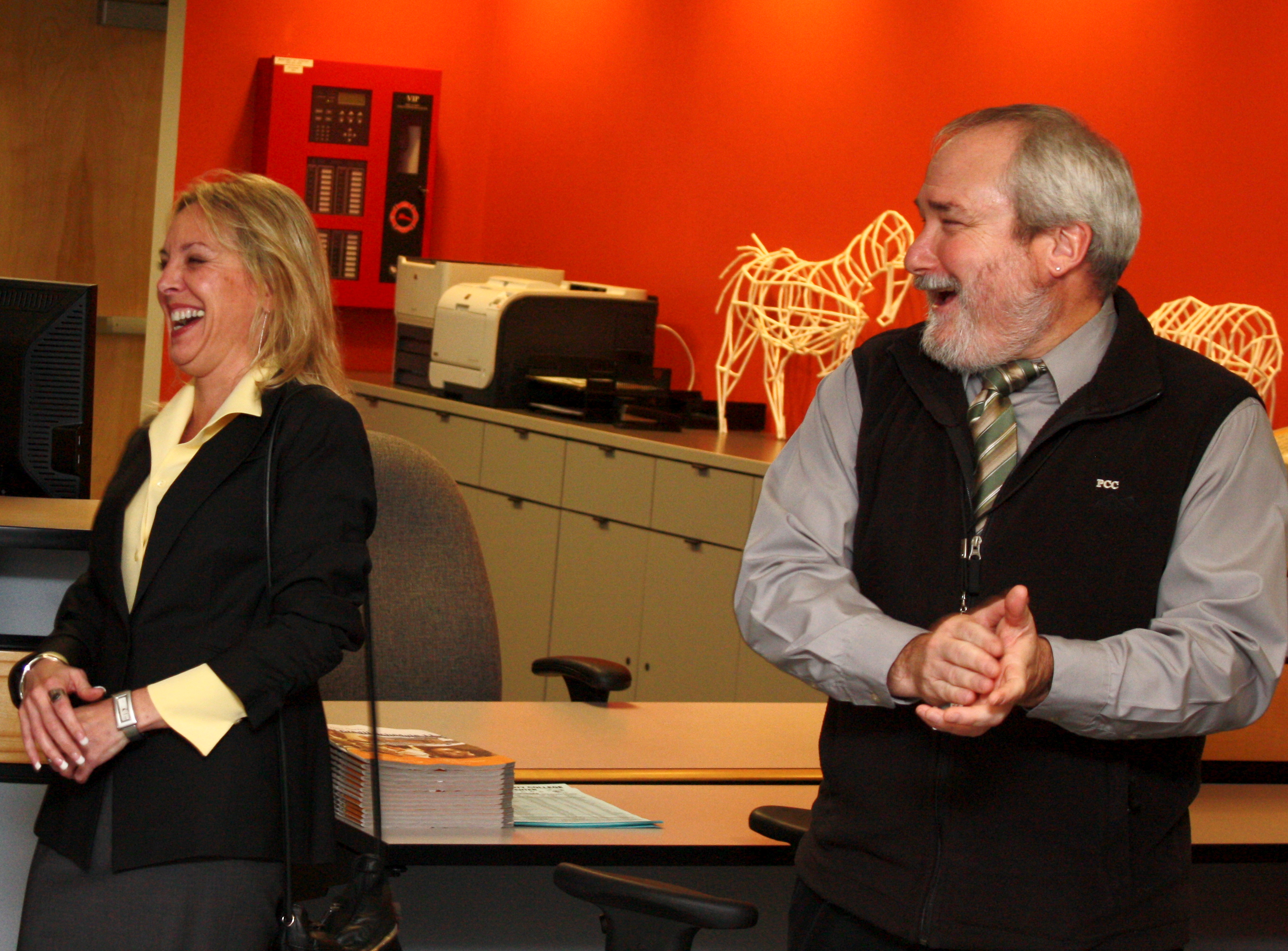 David Rule, Rock Creek Campus President, shares a laugh with PCC Board Member Deanna Palm. Rule and Palm were on hand to visit with staff, faculty and local officials for the Hillsboro Center's grand opening on Tuesday, Nov. 30.