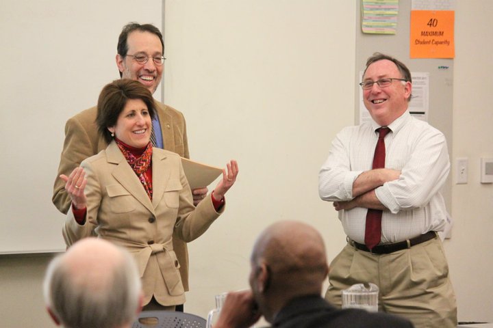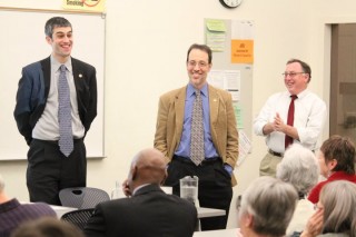 Top picture, from left, features Reps. Ben Cannon and Michael Dembrow, whose districts include the area served by the Southeast Center. With them is Rep. Peter Buckley of Ashland, co-chairman of the budget-writing Ways & Means Committee. He dropped by to offer a master class on State Budgets 101.