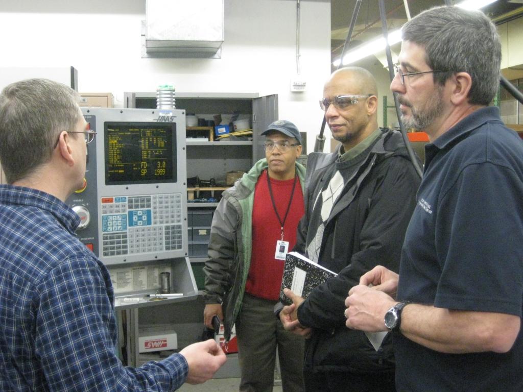 Left to right, student Rob Moser, chats with Dan Findley (Division Dean of Math and Industrial Technology), Kevin Johnson (senior program manager at the Portland Development Commission) and Pat Kraft (instructor for Machine Manufacturing Technology). Johnson paid a visit to learn more about the program.