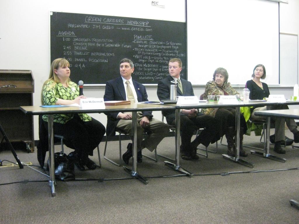 Panelists included Erin McDermott, human resource analyst, Oregon Department of Energy; Matt Hale, energy technology manager, Oregon Department of Energy; Charlie Johnson, green jobs economist, Oregon Employment Department; Vicki Lind, career counselor and co-author, “Portland Green Guide to Networking and Jobs”; and Becky Walker, program manager, Portland Energy Conservation, Inc.