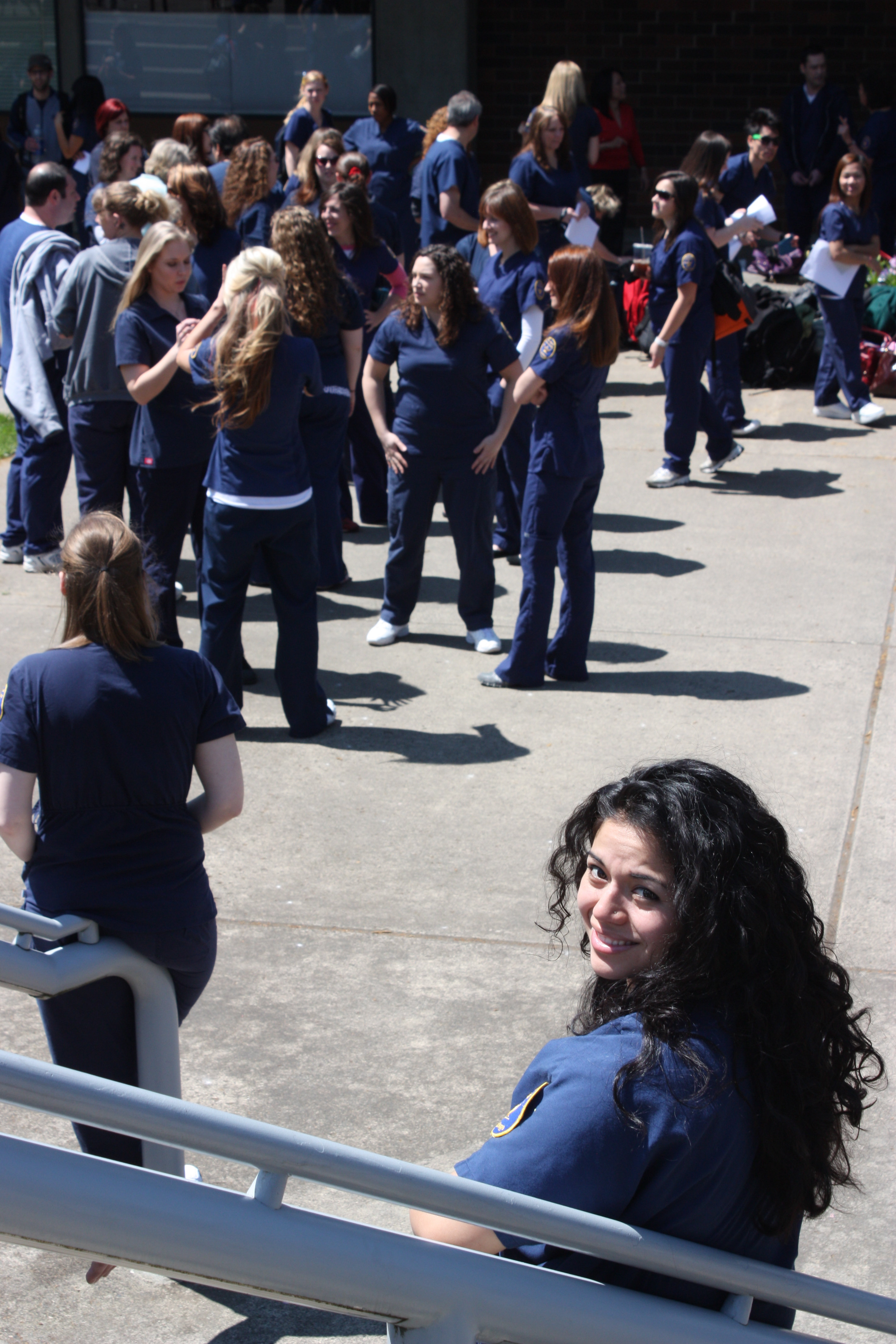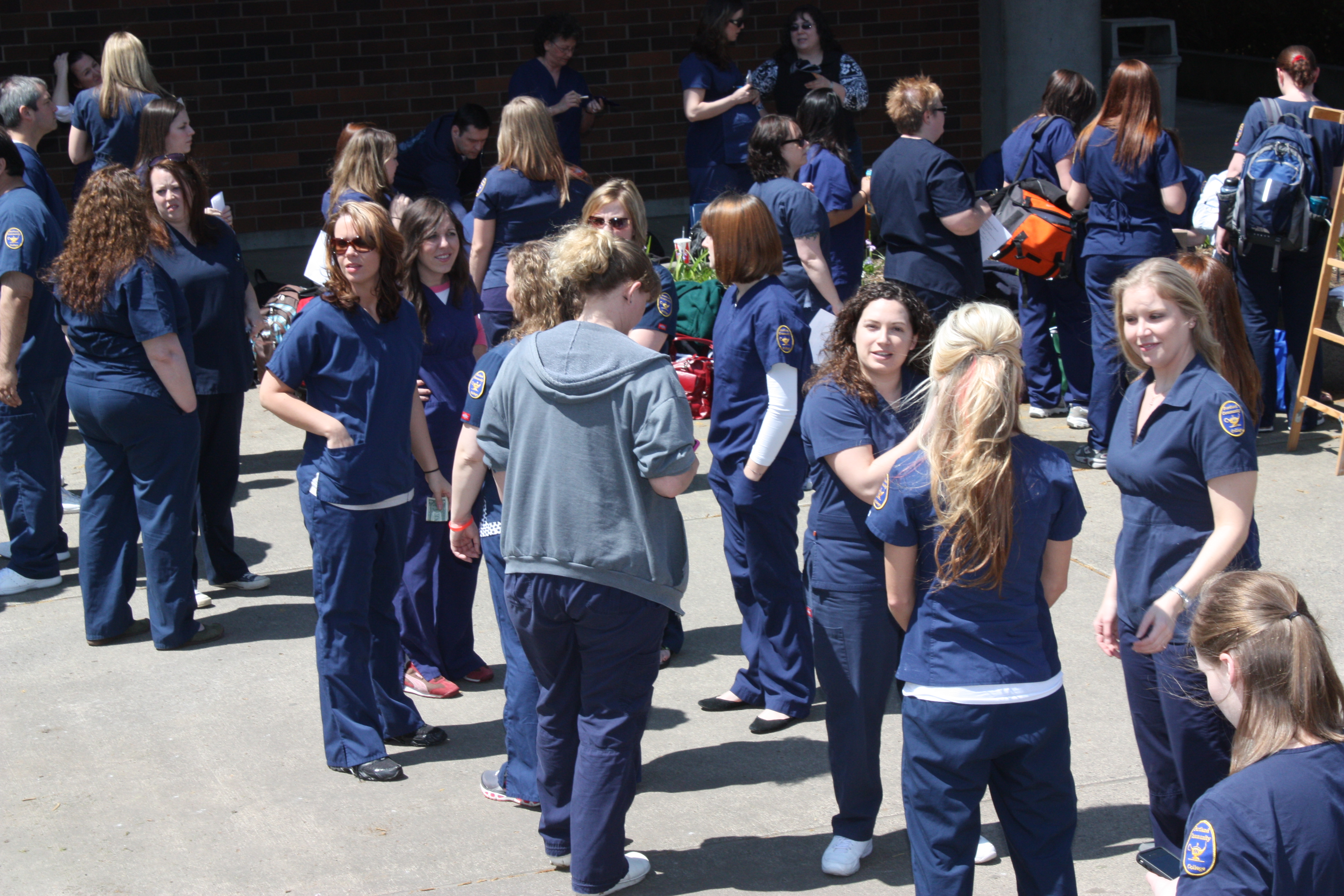 Students in the nursing program at Portland Community College get ready for their group photo on Wednesday, May 18, in front of the Performing Arts Center on the Sylvania Campus. Approximately 100 students per year participate from the popular program – which often draws up to 1,000 applications per year. The “pinning” ceremony takes place each spring to honor the graduating students.