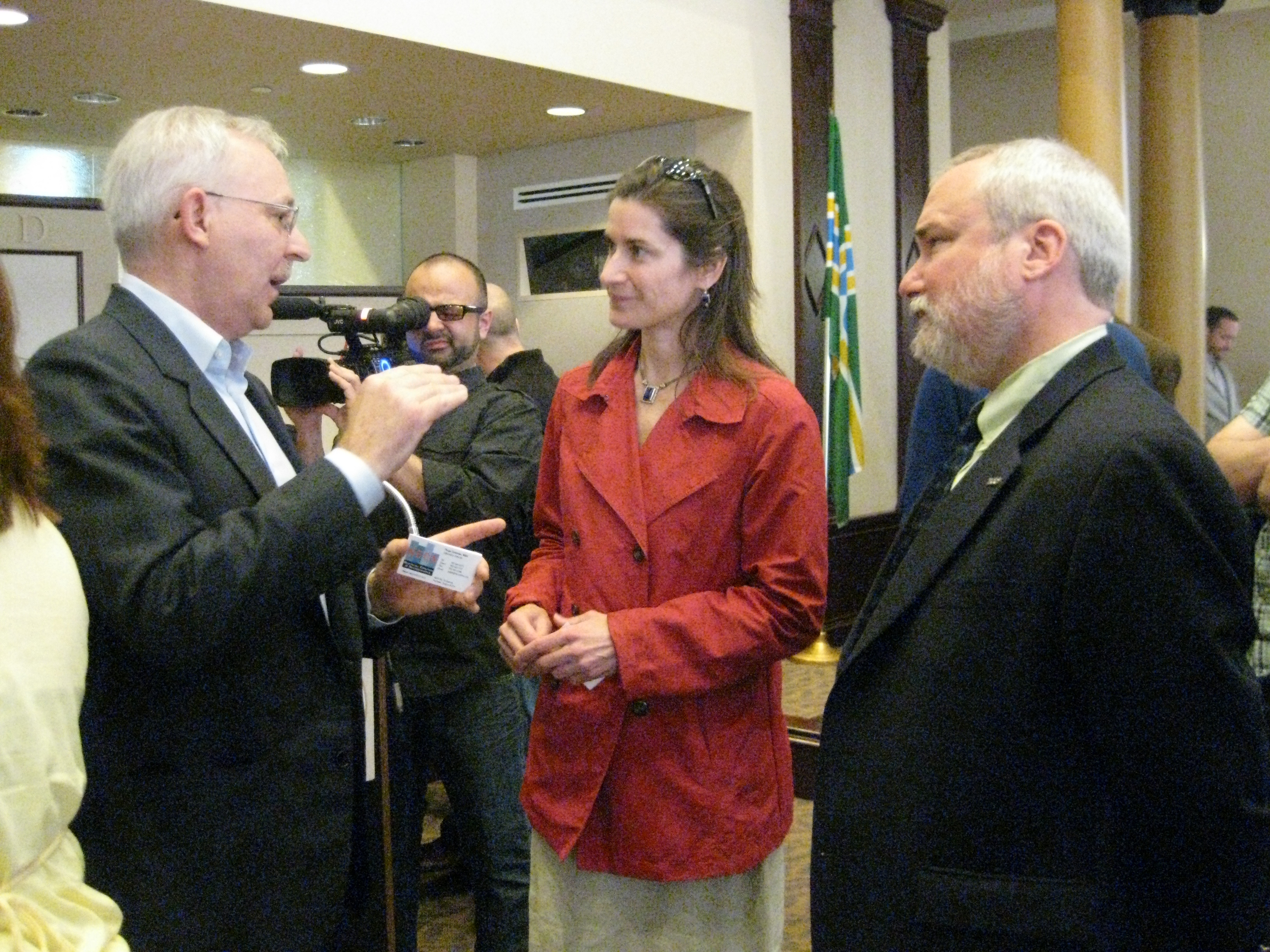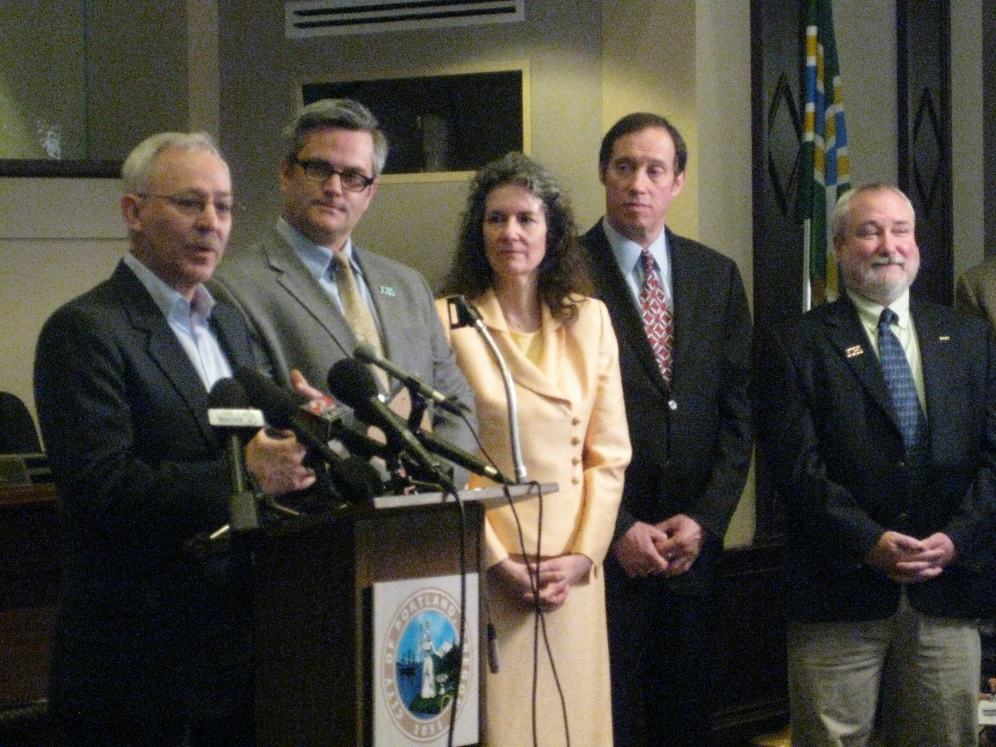 Tim Harris, CEO of SoloPower, addresses a press conference along with (from left) Portland Mayor Sam Adams, City Councilors Amanda Fritz and Dan Saltzman, and Dave Rule, president of PCC's Rock Creek Campus.