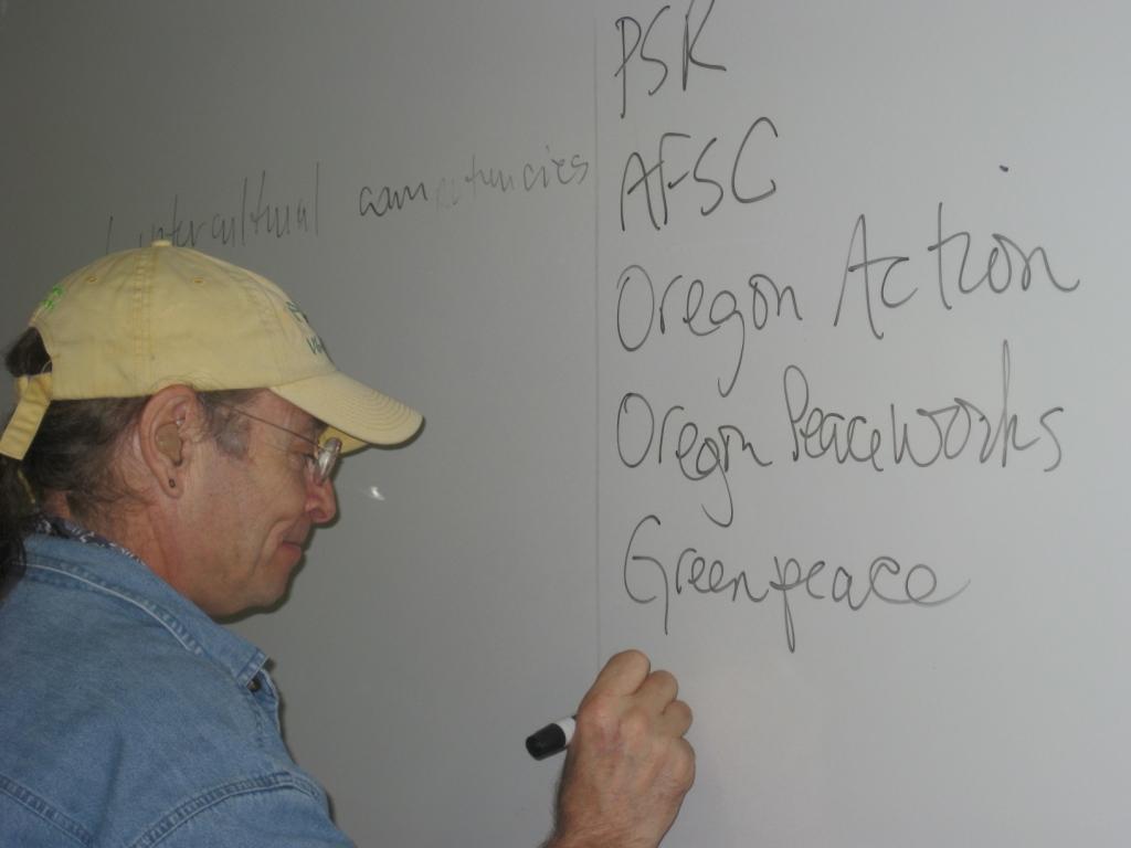Tom Hastings, sociology instructor at the Sylvania Campus and Portland State University, jots down ideas for possible community partners. Hastings participated in the daylong peace symposium sponsored by the regional Peace and Conflict Studies Consortium that included representation from PCC, PSU and George Fox.