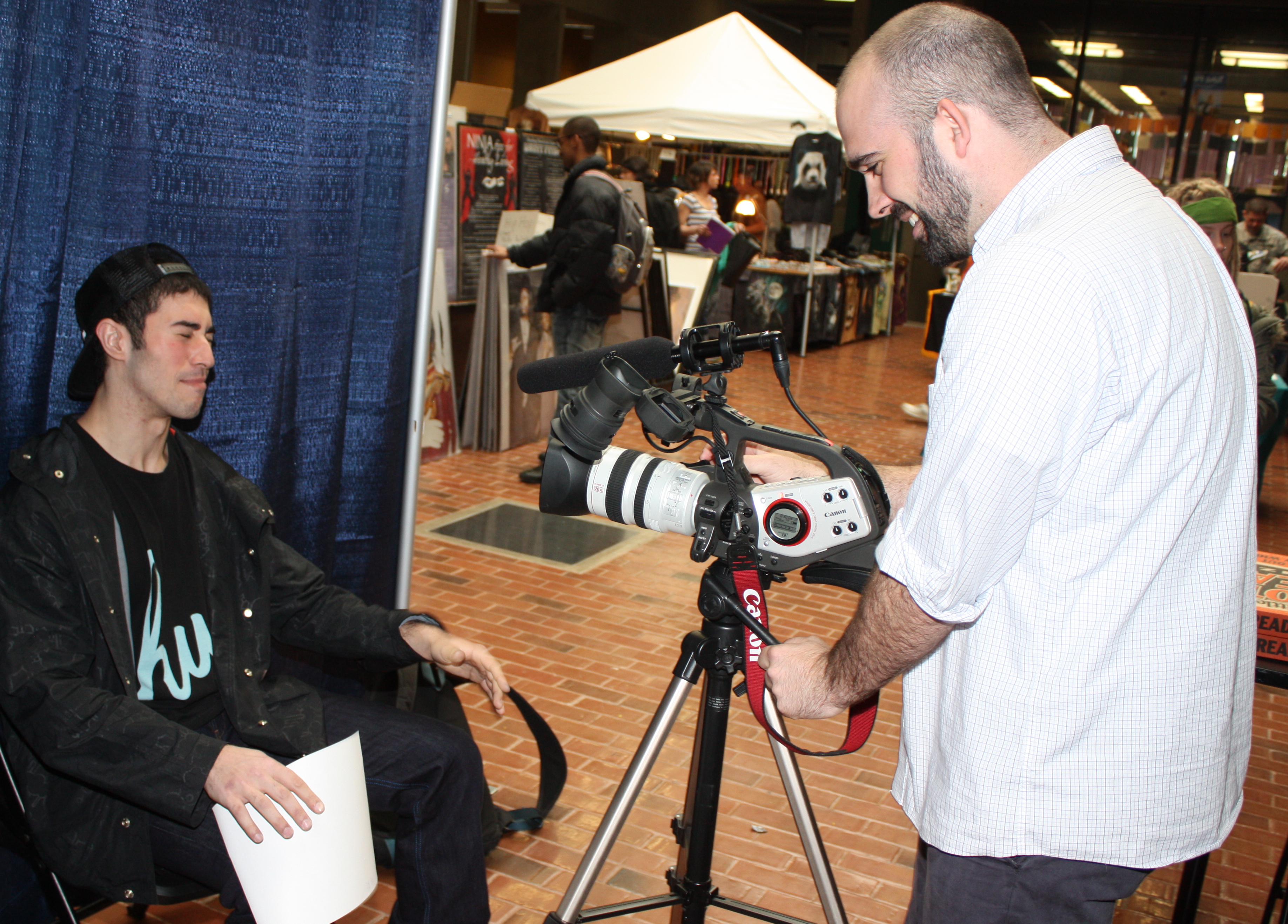A student winces at his performance as videographer Bryan Rosenberger eases him through the process.