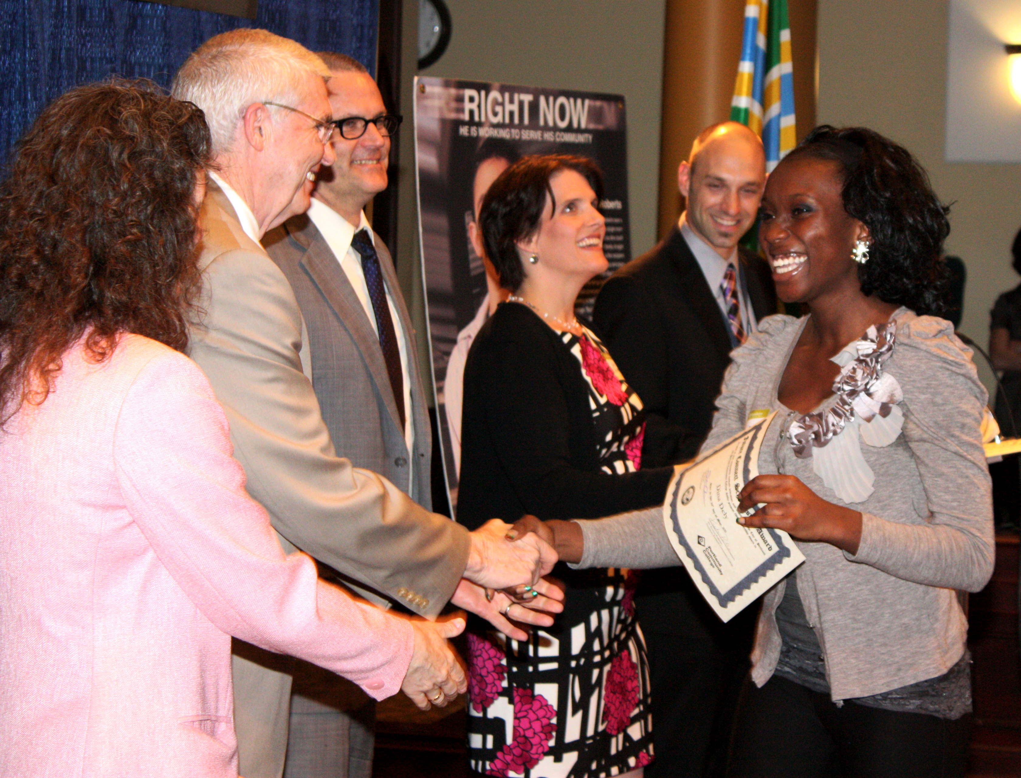 Mayor Sam Adams and Portland Community College Board Vice Chair Jim Harper awarded scholarships to graduating high school seniors who are at risk of not going to college, yet have high potential to succeed. Ninety-five percent of the first Future Connect scholars are first generation college students. With support from the City of Portland and donations to the PCC Foundation, 200 students will receive scholarship support and dedicated coaching to earn a degree at PCC.