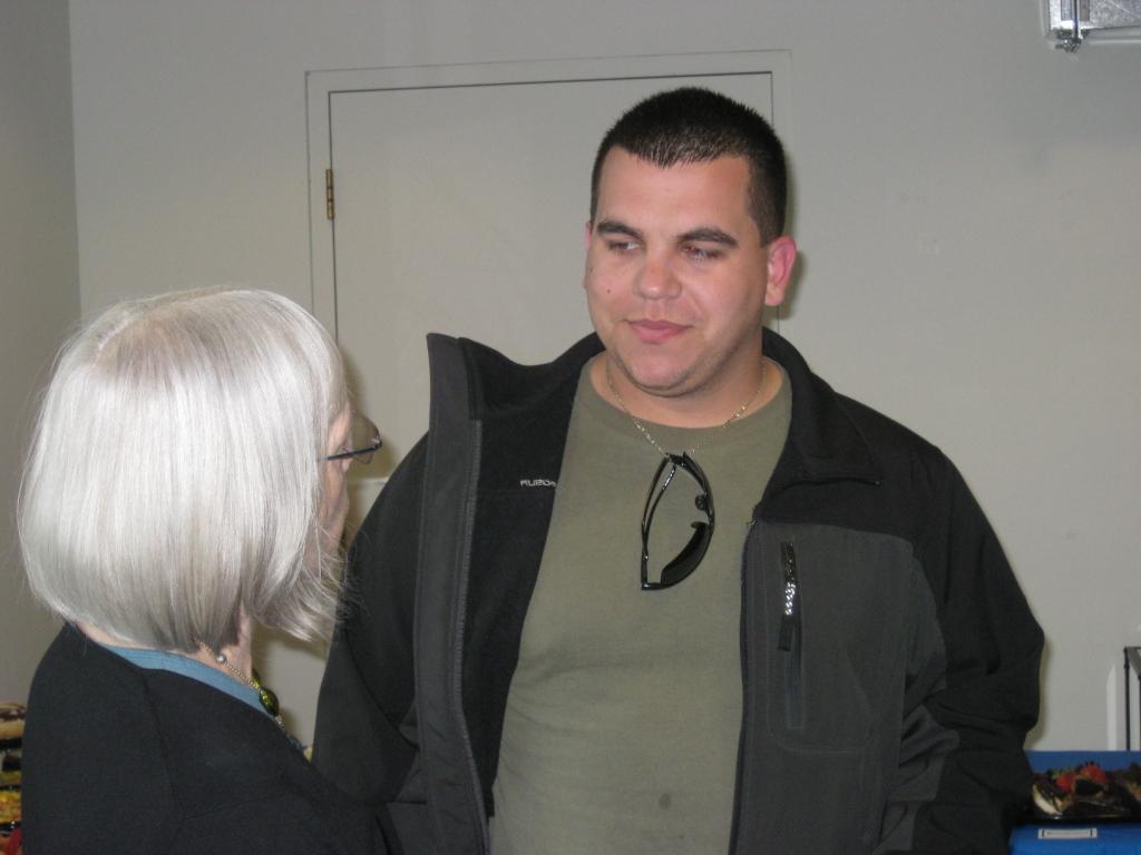 Linda Gerber, president of the Sylvania Campus, chatted with Newberg student Tim Kretzschmer at the end-of-the-year celebration.