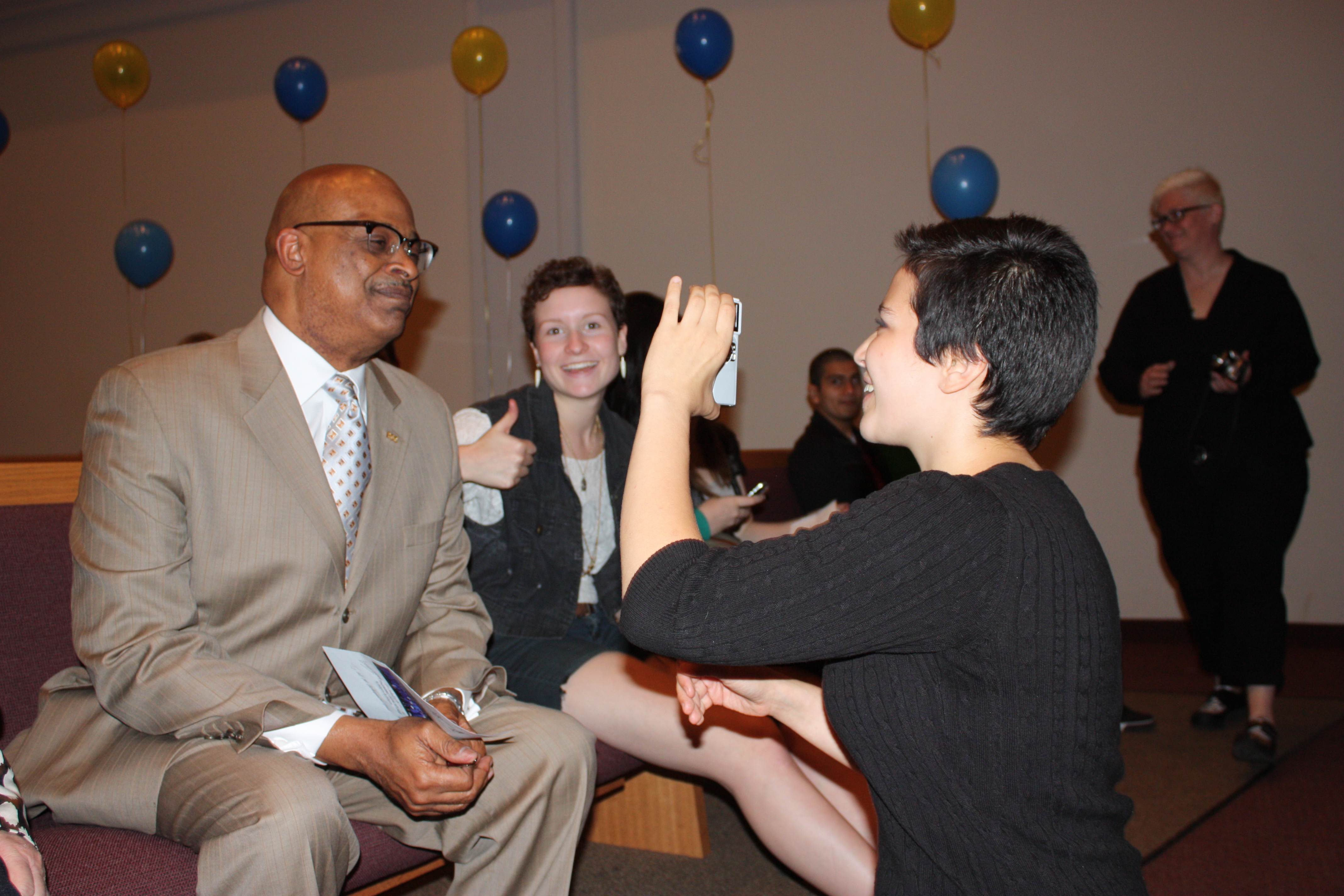 PCC Prep student Mariana Rodrigues interviews President Preston Pulliams during Thursday's graduation celebration.