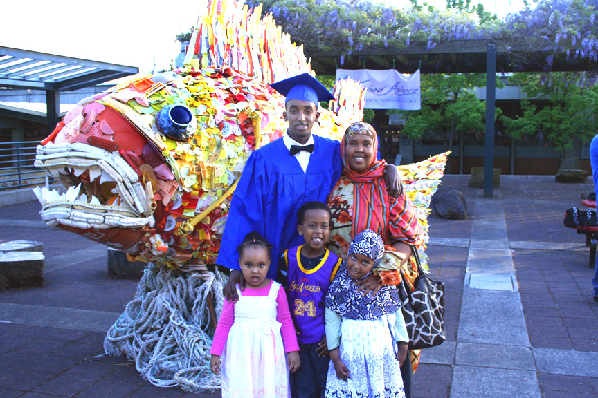Abdulla Abdulaziz, who lives in Tigard, poses for a photo with his family in front a giant fish from the “Washed Ashore” art exhibit currently on display at the PCC Sylvania Campus. Abdulaziz is a graduate of this year’s GED class from PCC Sylvania. The graduation ceremony took place on campus on June 4.