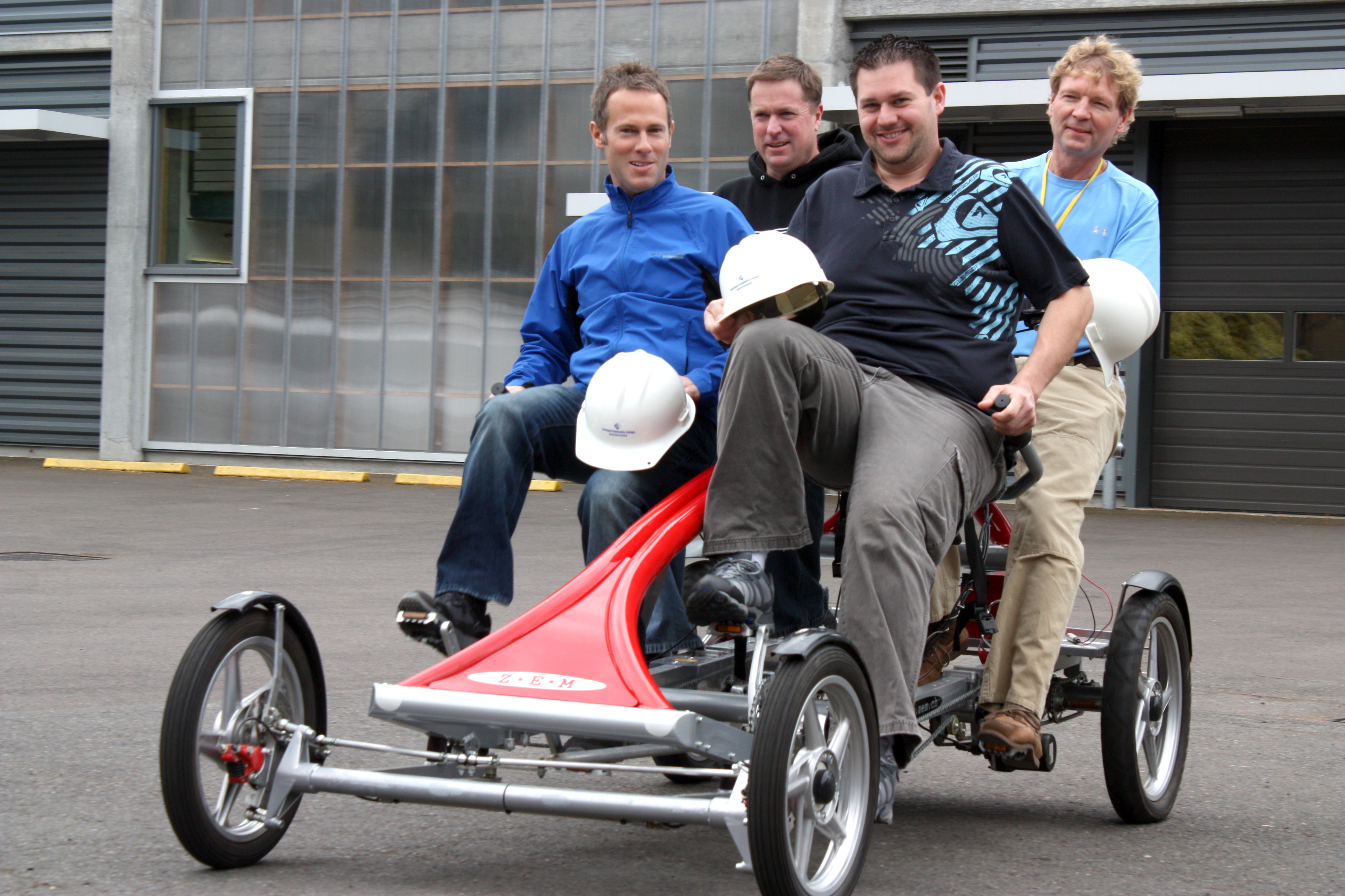 Gregg Meyer (far right) rides the Civil and Mechnical Enginnering Technology Program's new cycle they plan to fit with an electric motor assist system.