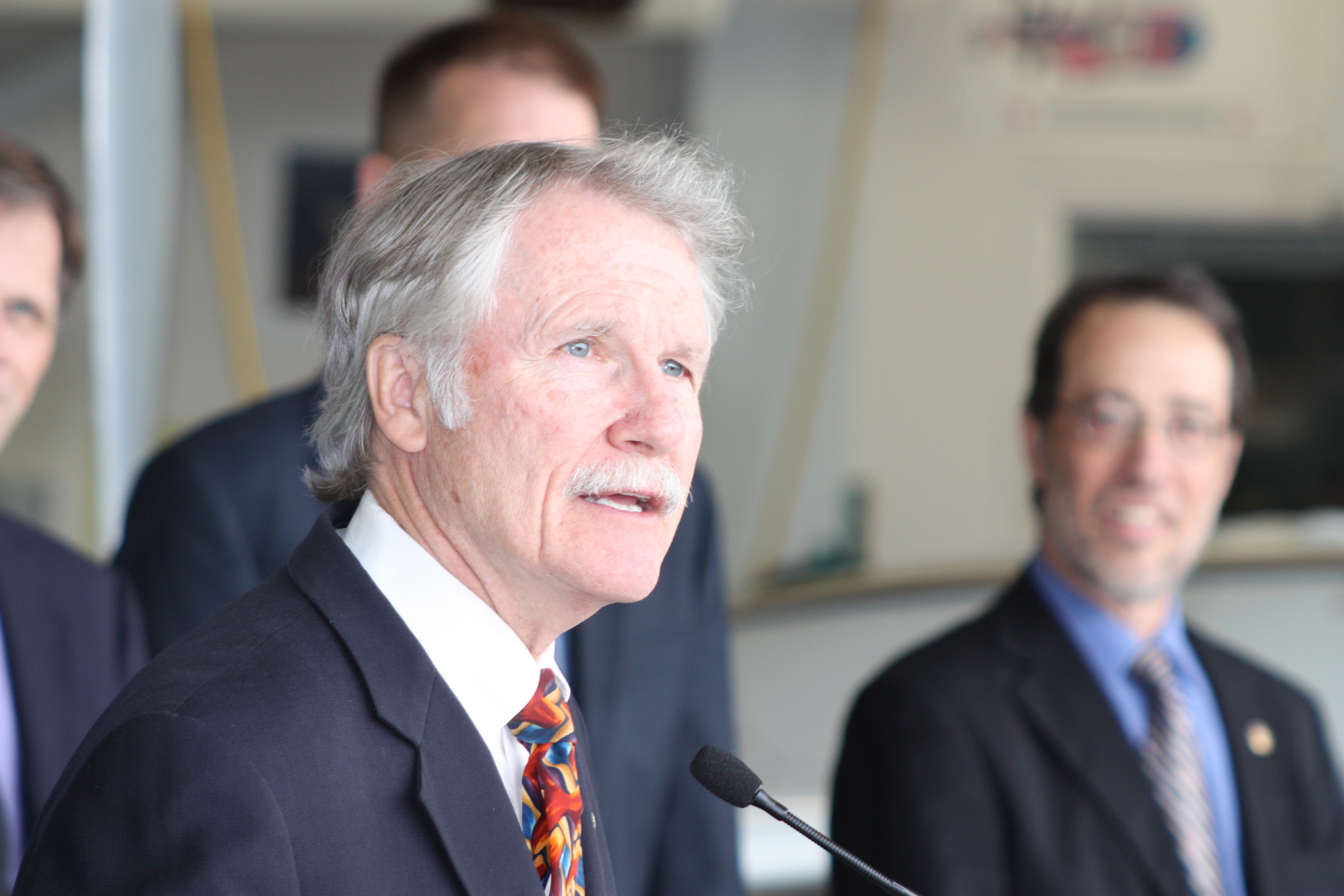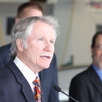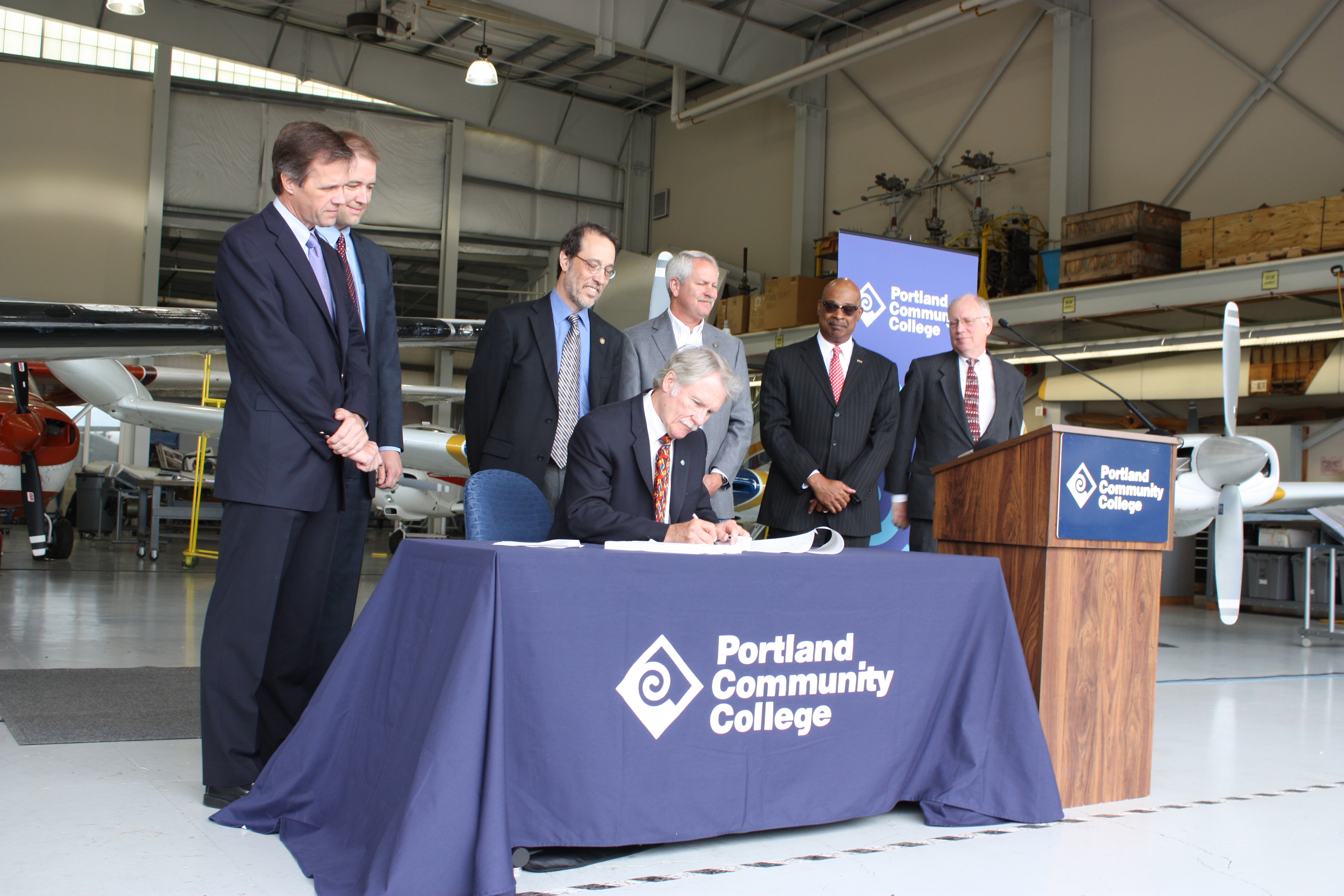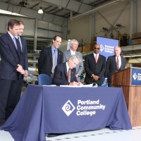 PCC District President Preston Pulliams, State Sen. Mark Hass (Washington County/Southwest Portland), Reps. Michael Dembrow (North Portland), Tobias Read (Beaverton) and Mark Johnson (Hood River), Oregon State University President Edward Ray, and Portland State President Wim Wiewel joined the Governor in the hangar.