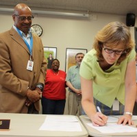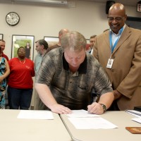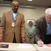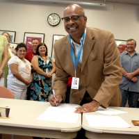 At the Portland Community College Board of Directors’ retreat on Friday, August 26, chair Jim Harper, District President Preston Pulliams and the college’s union leaders signed their respective collective bargaining agreements. Both union contracts are for the next four years and expire in 2015. At the board retreat, union leaders joined the college board in a signing ceremony during a break in the day’s schedule.