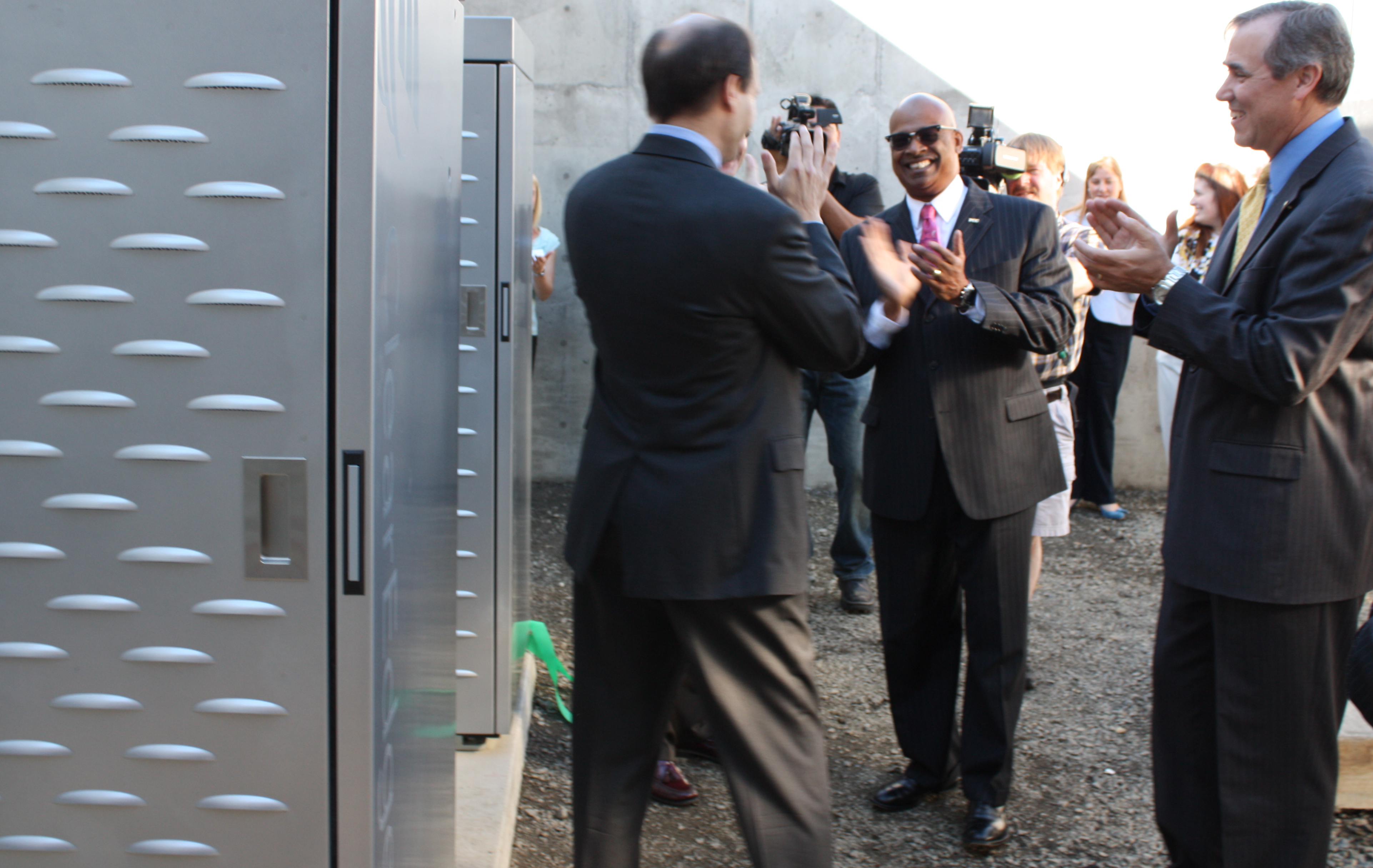 PCC District President Preston Pulliams enjoys a moment with dignitaries at the ClearEdge fuel cell announcement on Thursday, Sept. 29. The participants in Thursday’s press conference applaud following the ribbon cutting. At left is one of the two now-operational fuel cells.
