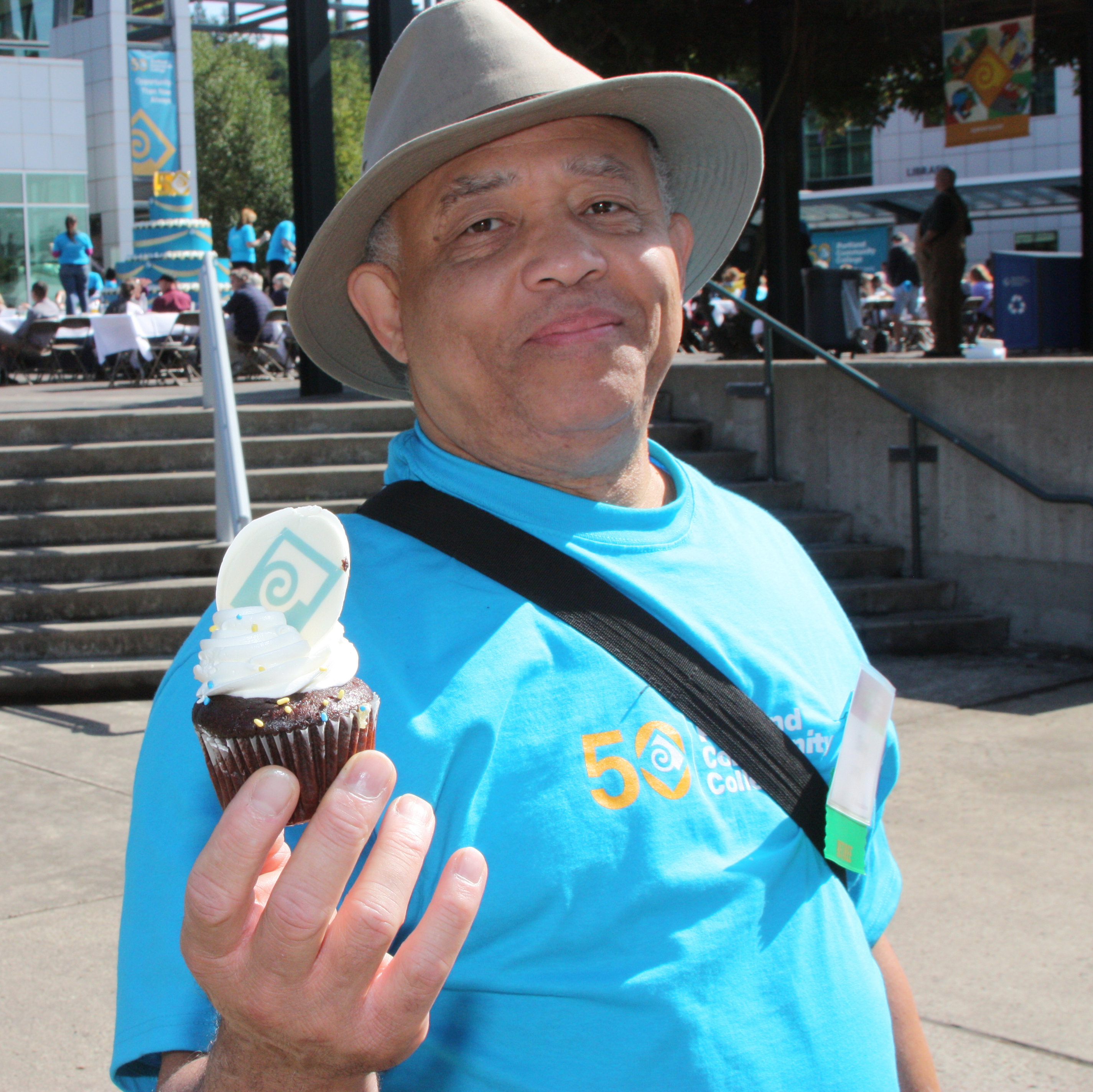 Retiree Dave Jones shows off the 50th anniversary cupcakes.