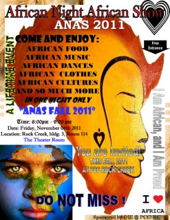 Next month is International Education Week from Nov. 14-18 and the students are organizing a cool pre-party to get people revved up for it. Led by Edgard Musafiri, an international student from Congo, the Rock Creek Campus is hosting “African Night, African Show 2011” from 6-9 p.m., Friday, Nov. 4, in Room 114 of Building 3. There will be African food, dances, cultural clothing and so much more.