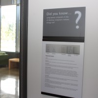 The exposed concrete slab and concrete shear walls act as thermal mass in the building, helping to maintain even indoor temperatures all year long. The concrete, which has better storage capacity for heating and cooling than the surrounding air, absorbs and stores heat or cold and then releases it many hours later. The concrete slab has tubing with 90-degree water running through it to heat the building to 68 degrees.