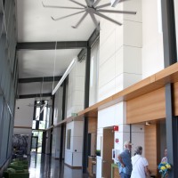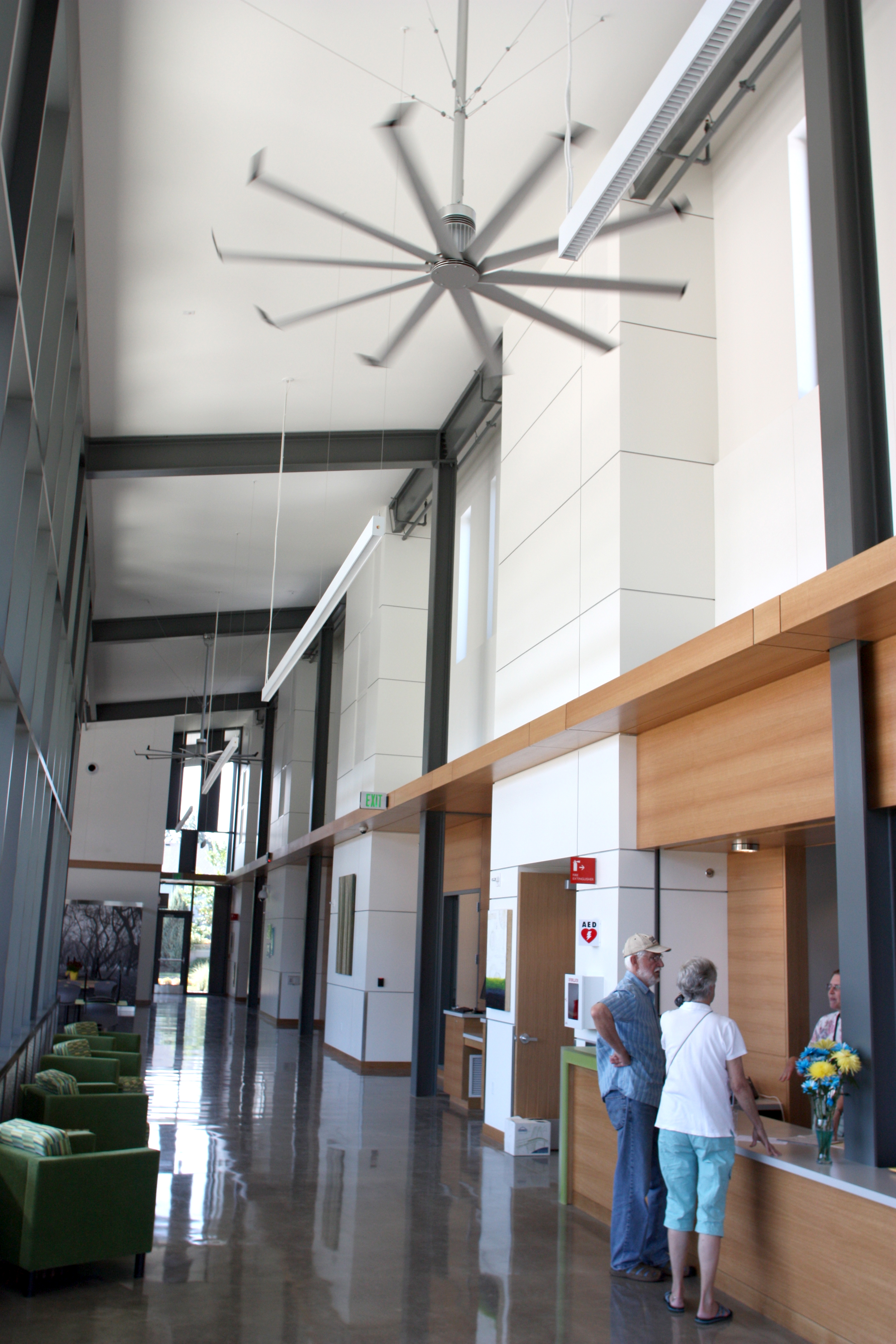 To do this, the Newberg Center has innovative heating and cooling systems. When open, the louvers on the exterior wall of the building draw in fresh air from outside and release hot air out through the five stacks along the building’s central spine. Ceiling fans throughout the building can be turned on to create air movement that makes it feel three-degrees cooler.