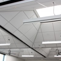 The roof and ceilings have structurally insulated panels (SIP), which are two panels with insulated foam in between them. This provides more insulation than a typical wall because there are less thermal breaks than using studs, providing an even temperature throughout the building. On top of these SIP panels and just underneath the roof membrane is a leak detection system.