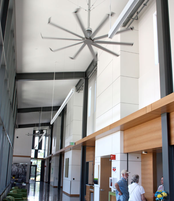 To do this, the Newberg Center has innovative heating and cooling systems. When open, the louvers on the exterior wall of the building draw in fresh air from outside and release hot air out through the five stacks along the building’s central spine. Ceiling fans throughout the building can be turned on to create air movement that makes it feel three-degrees cooler.