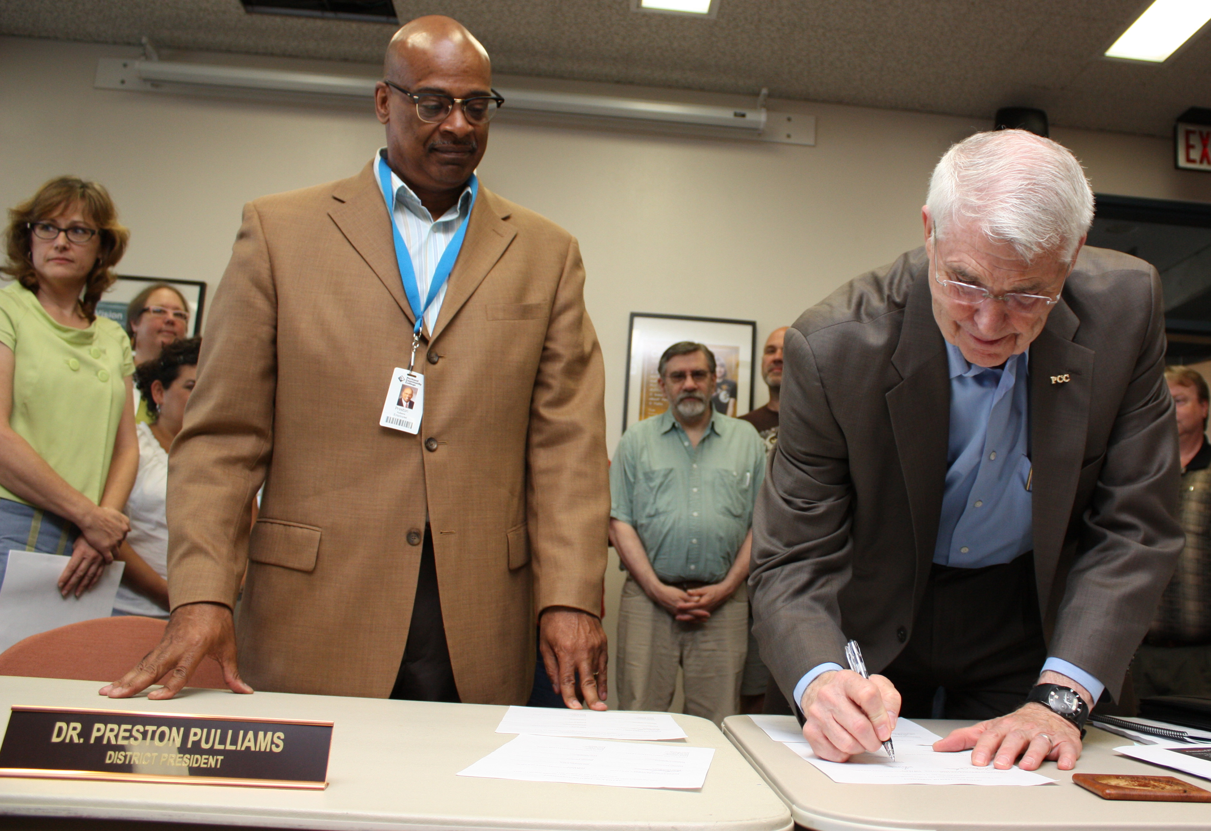 One of his first duties as board chair this year was to sign the new faculty and classified staff labor agreements with District President Preston Pulliams (left).