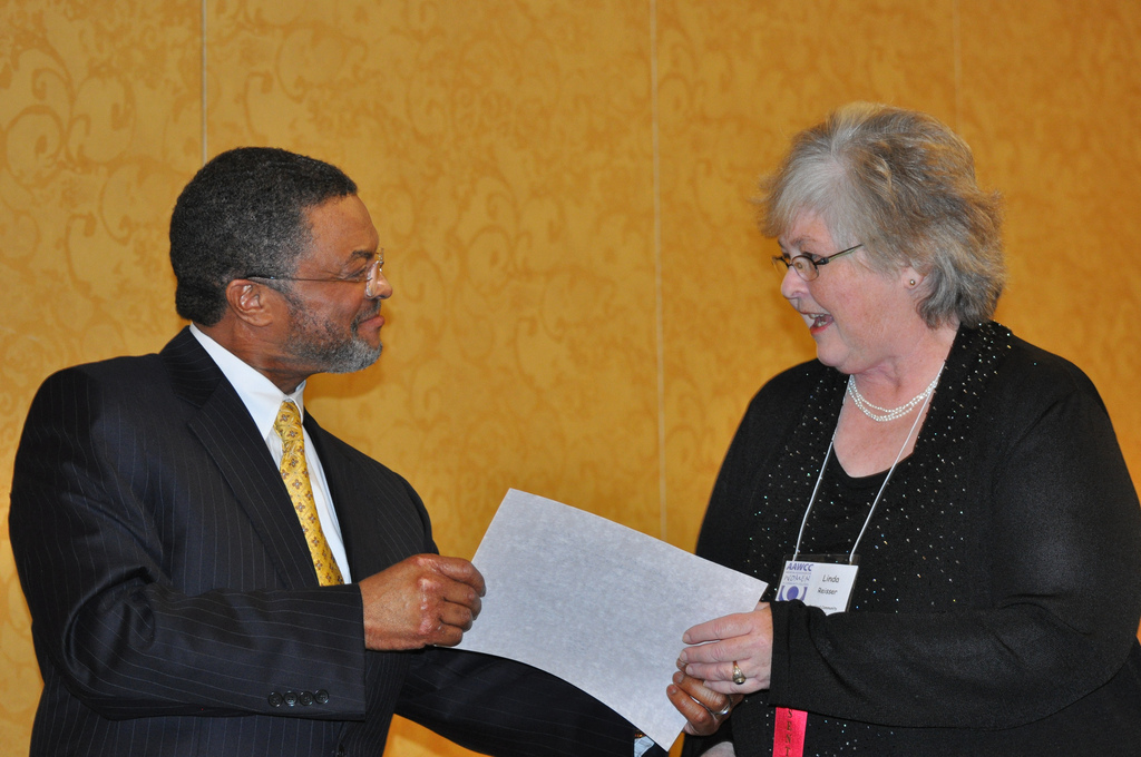Algie Gatewood, PCC Cascade Campus president, gives Linda Reisser, Cascade's Dean of Student Development, a 2011 AAWCC Excellence Award.