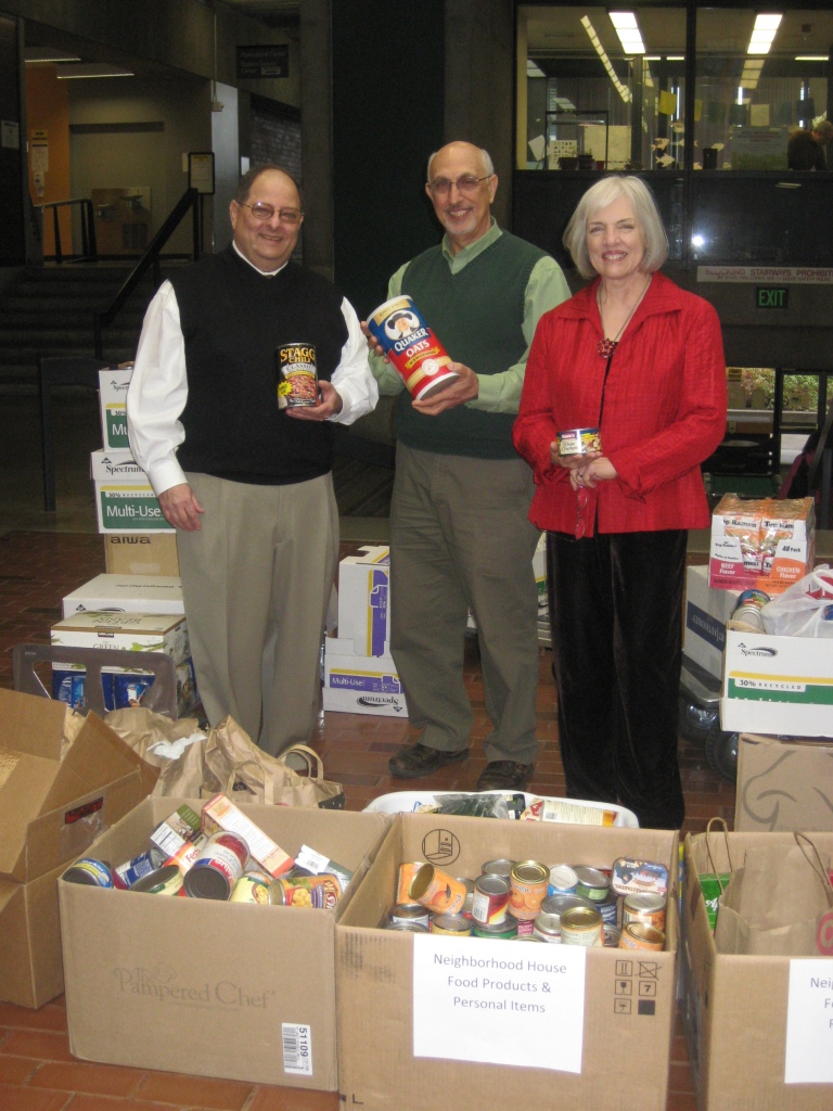 (from left to right) Dave Happ, Winter Fest event chair, Rick Nitti, Neighborhood House executive director, and Linda Gerber, Sylvania Campus president, celebrate the large haul of canned and non-perishable food for Neighborhood House’s food pantry and Sylvania’s student-run food canteen. The collection stemmed from the 2011 Winter Fest celebration at Sylvania.
