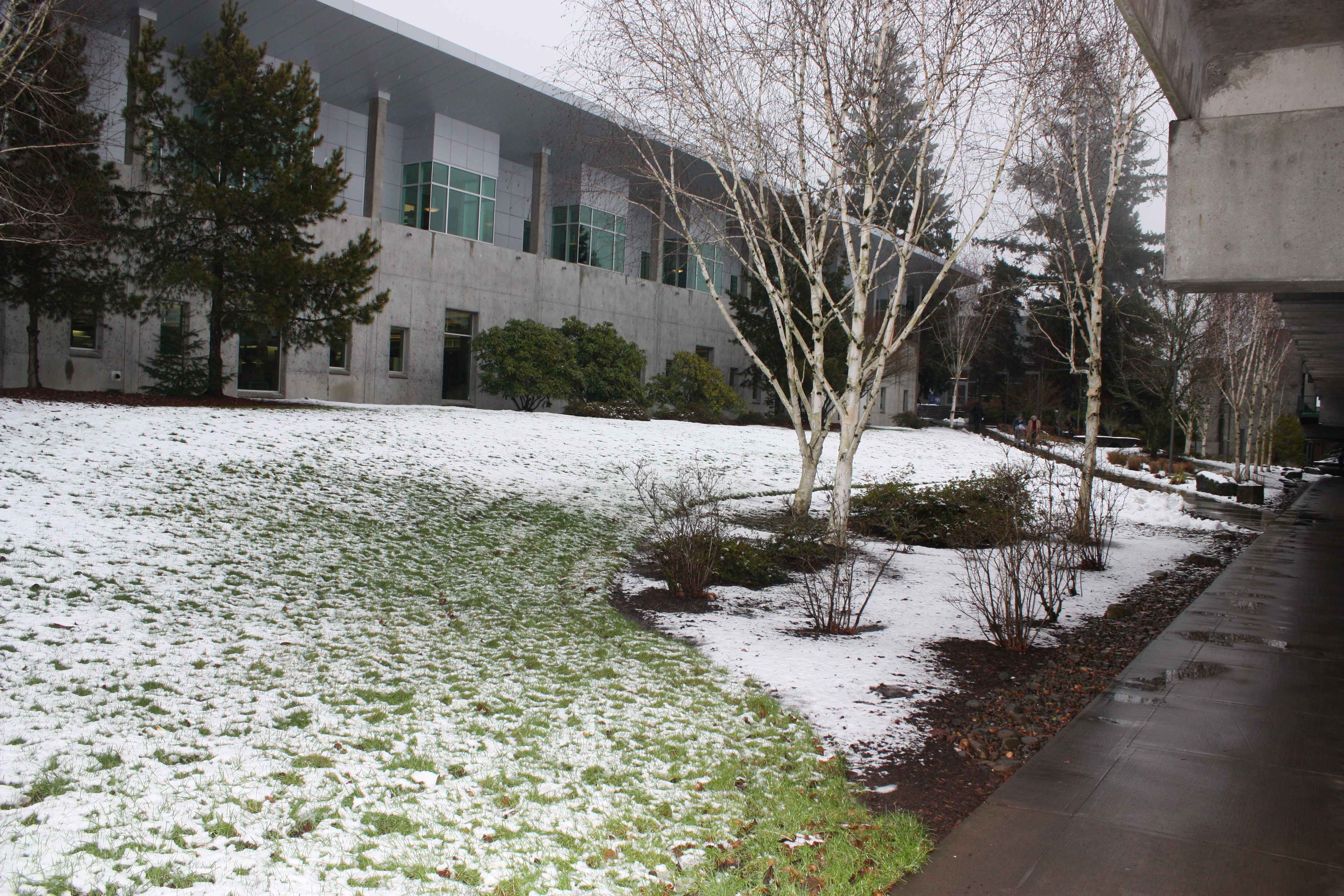 The snow from the morning melted some before another round of snow (background) hit the campus midday on Tuesday, Jan. 17.