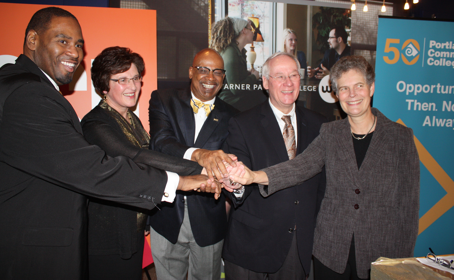 The players in the new pact, left to right, include PSU Director of Student Aid Phillip Rodgers, Warner Pacific President Andrea Cook, PCC District President Preston Pulliams, Oregon State President Edward Ray and PPS Superintendent Carole Smith.