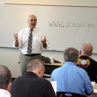 Brad Avakian (left) visits with PCC staff at Willow Creek in May.