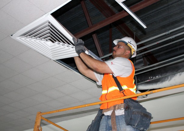 Ivan Ibanez with In Line Commercial Construction, demolishes a ceiling at Cascade Campus.
