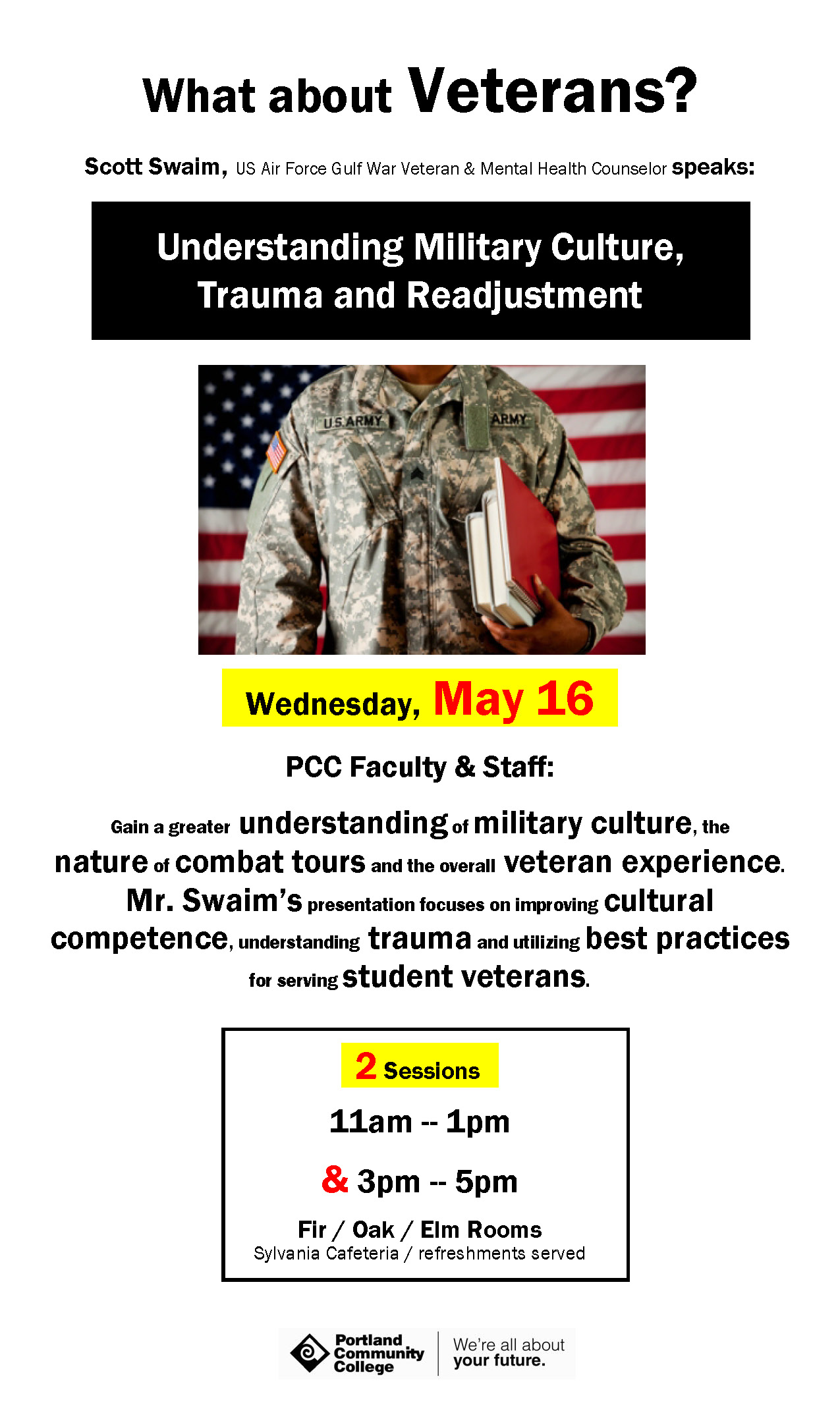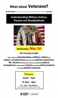 All PCC faculty and staff are invited to “Serving Student Veterans: Understanding Military Culture, Trauma and Readjustment,” on May 16.