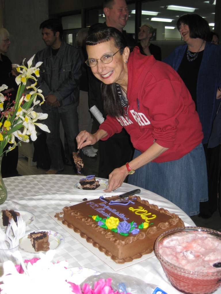 Nursing instructor Teri Mills cuts the cake at a party for second-year nursing students on June 6.