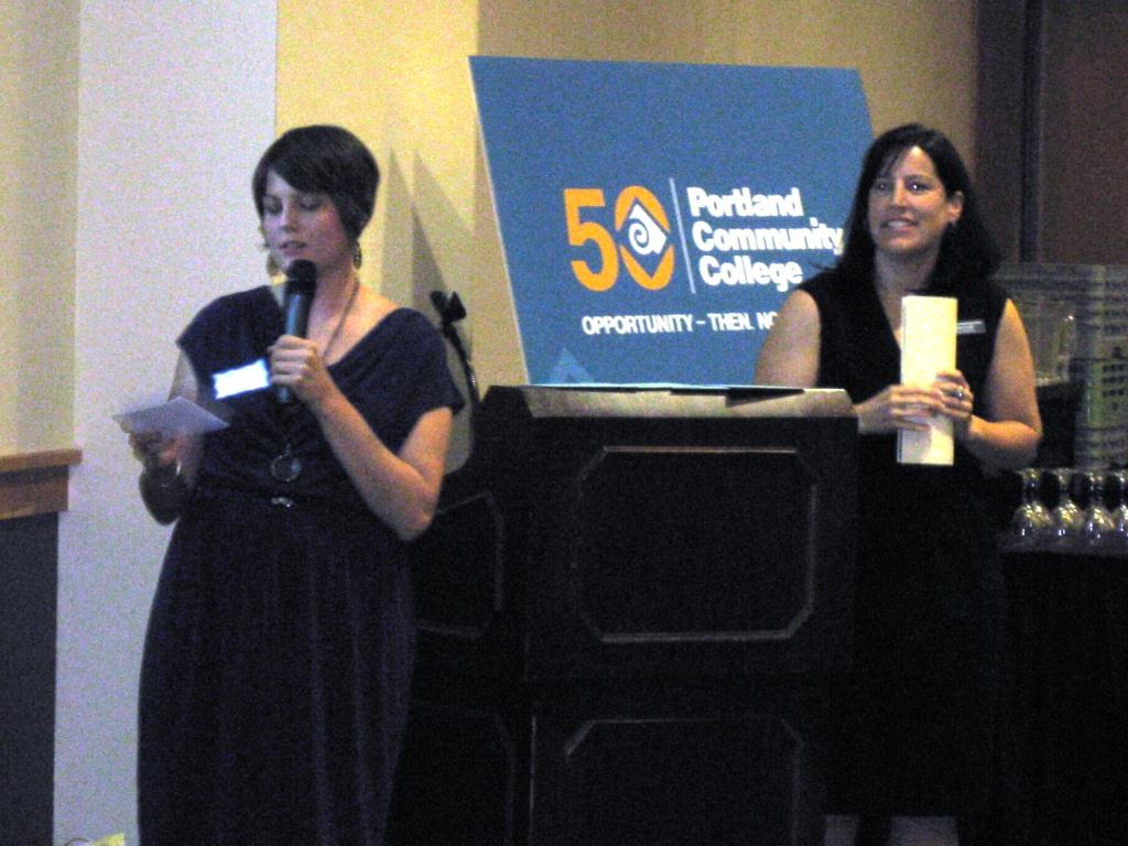(from left to right) Nicole Herbert and Sarah Tillery of PCC’s Service-Learning program introduce community partners – Oregon Campus Compact, Children’s Book Bank, and AmeriCorps Students in Service – at this year’s celebratory Service-Learning dinner on June 8.