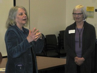 Jan Abushakrah (left), the director of PCC’s gerontology program, describes the Plus 50 Champion College designation that PCC has been awarded by the American Association of Community Colleges, as Linda Gerber (right), PCC Sylvania Campus president, looks on.