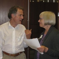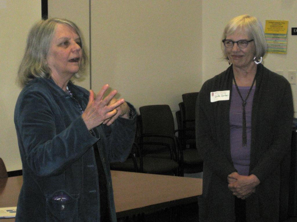 Jan Abushakrah (left), the director of PCC's gerontology program, describes the Plus 50 Champion College designation that PCC has been awarded by the American Association of Community Colleges, as Linda Gerber (right), PCC Sylvania Campus president, looks on.