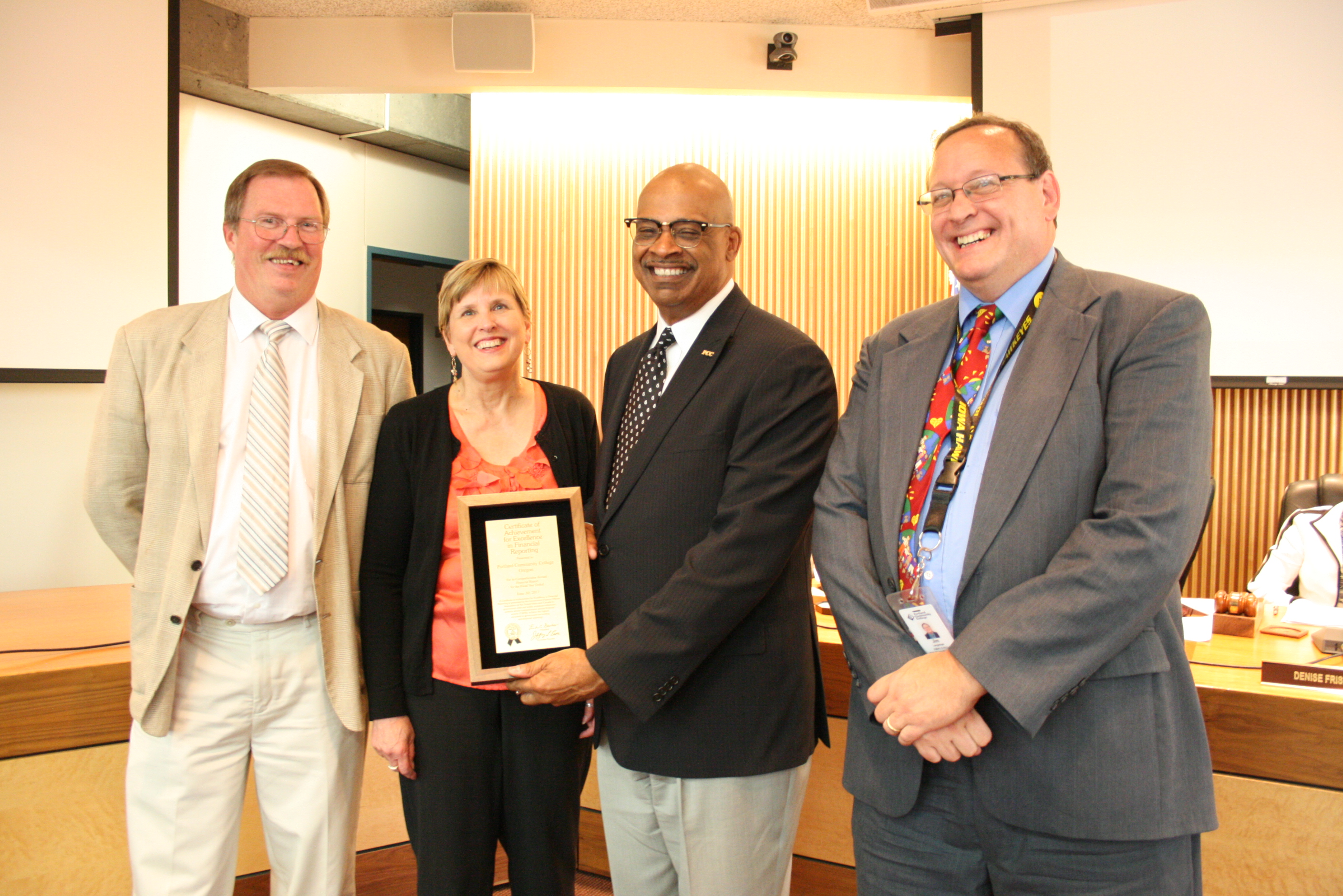 District President Preston Pulliams presents the Certificate of Achievement for Excellence in Financial Reporting to Jim Crofts, Accounting Services Manager (left), Sally Gregory, Financial Reporting Manager and Jim Langstraat, Associate VP of Finance