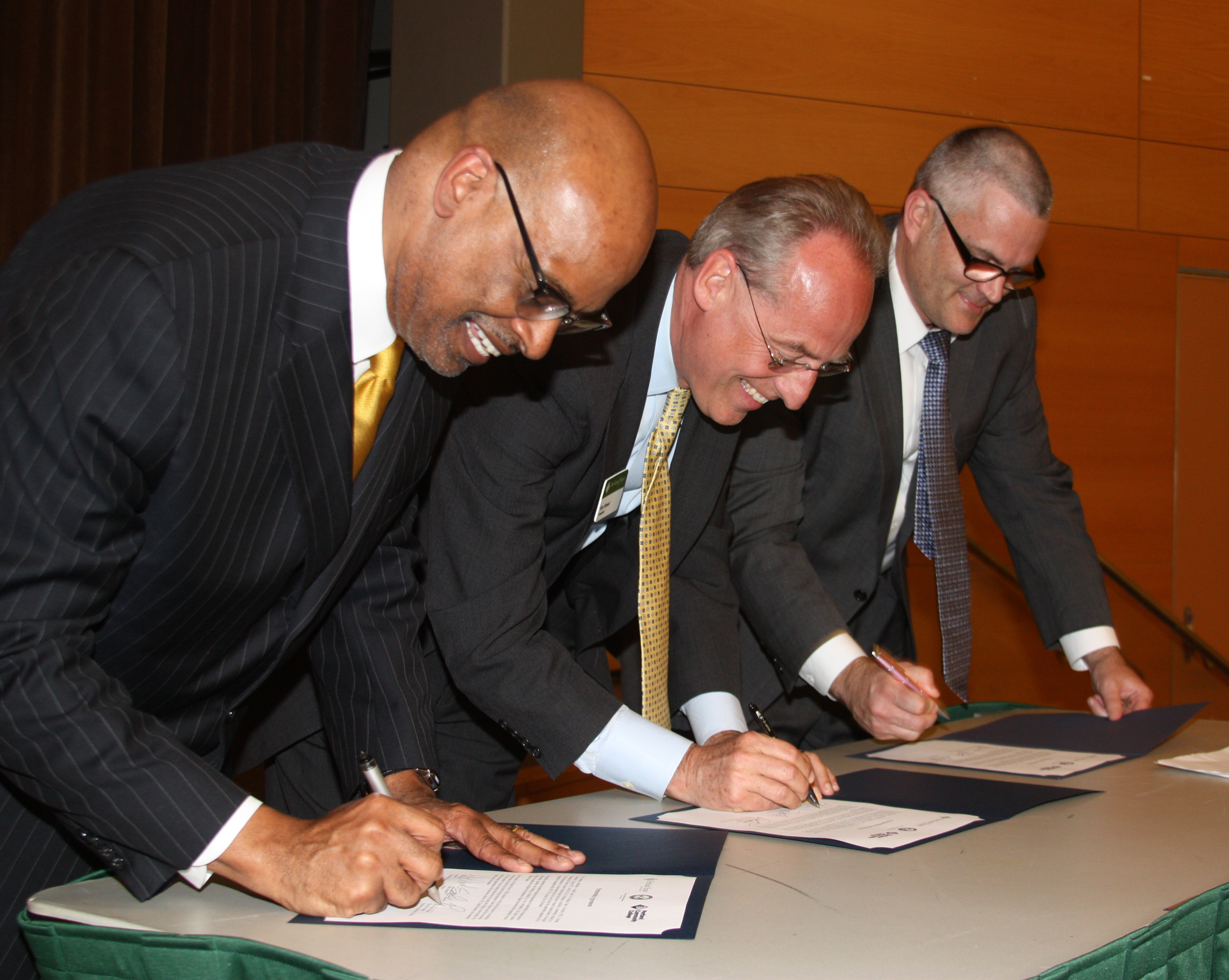 Portland Mayor Sam Adams (far right), President Pulliams and Portland State University President Wim Wiewel signed an agreement earlier this year establishing a partnership between PSU and Future Connect scholars, which will allow them to continue on to earn a bachelor’s degree at Portland State. This is one of many initiatives Pulliams is involved with to foster student success.