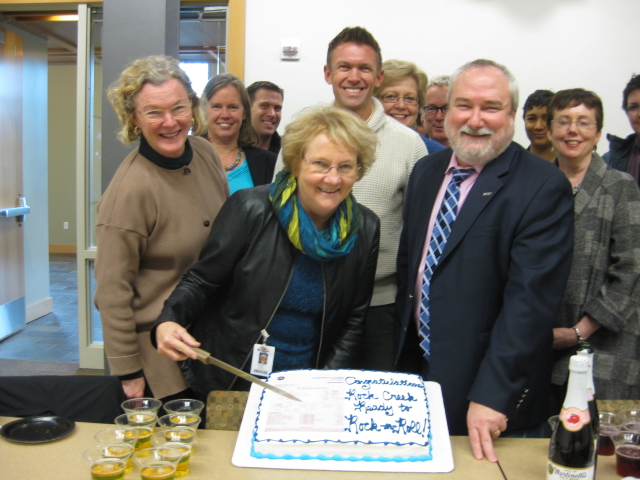 Members of the Rock Creek Bond Internal Steering Committee break out the cake and Martinelli’s cider to celebrate the successful filing of permits and paperwork required for the construction of Building 7.
