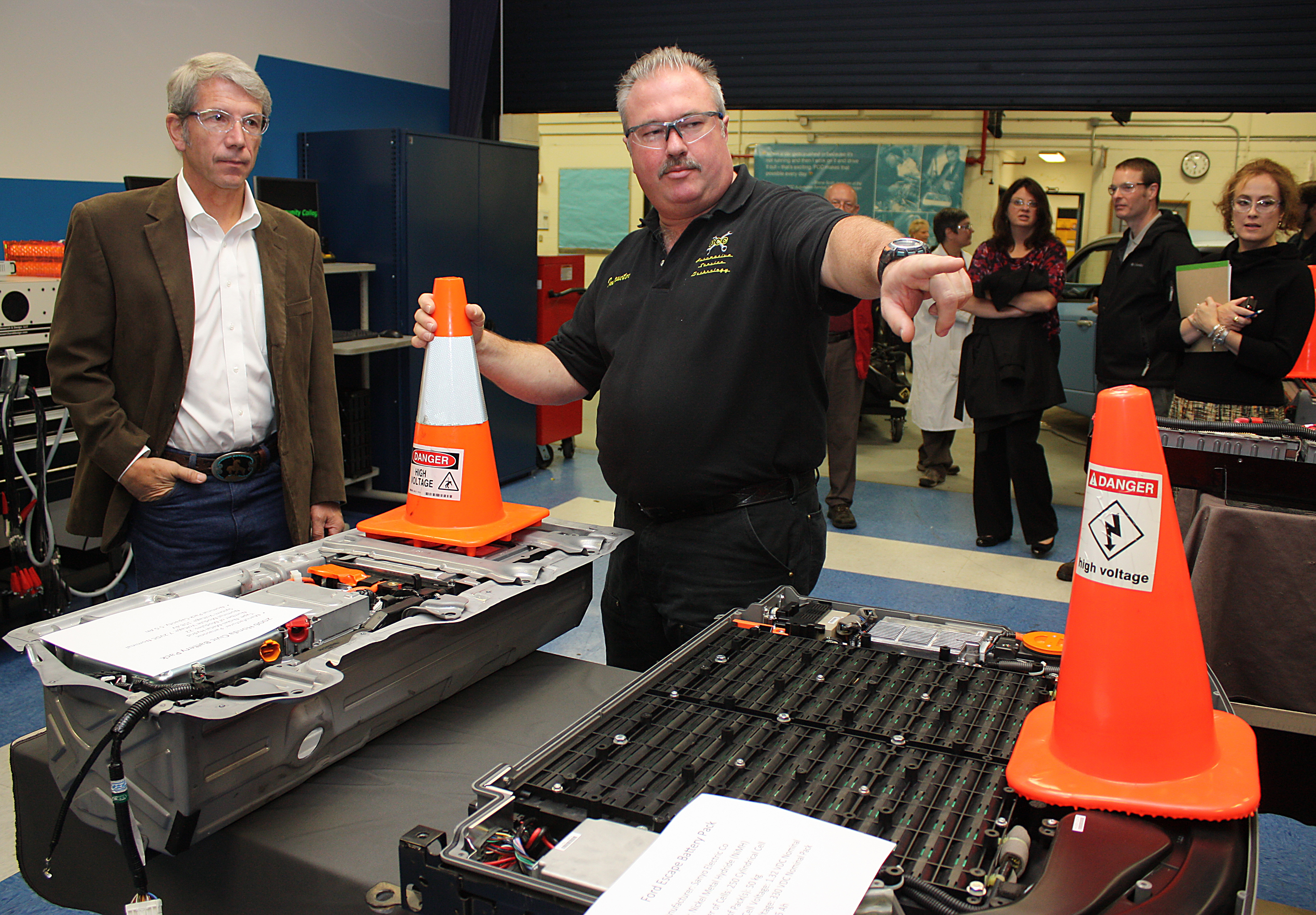 Russ Jones (right), Automotive Service Technology Program instructor, shows Congressman Kurt Schrader the Ford (right foreground) and the Honda Civic battery packs.