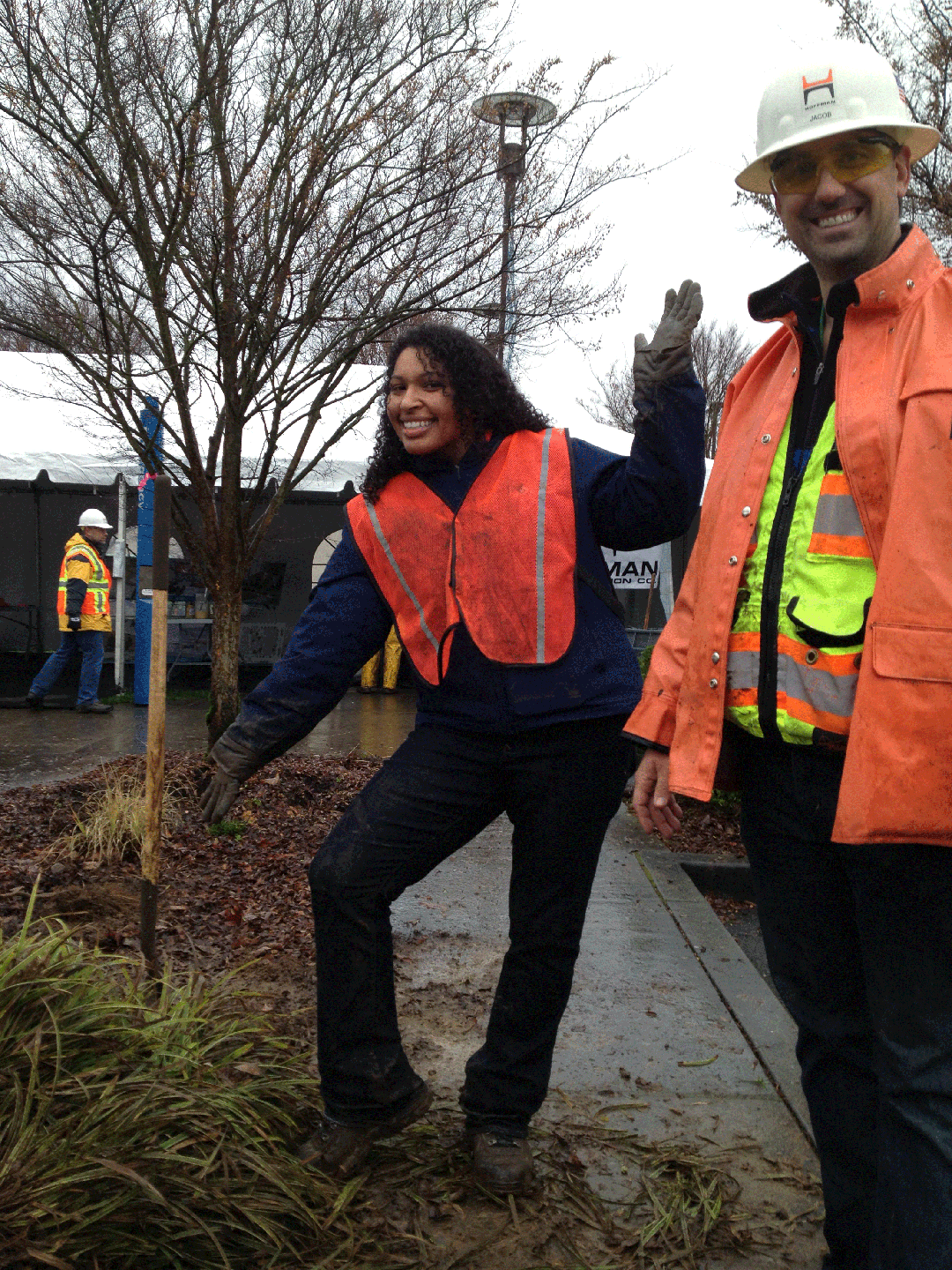 “It was cold and wet, and still people showed up for the event,” said Rebecca Ocken, Bond Project Manager for Cascade Campus. “Some participants were creative in their approach using roof racks and walking wheelbarrows to get their new plants home. “