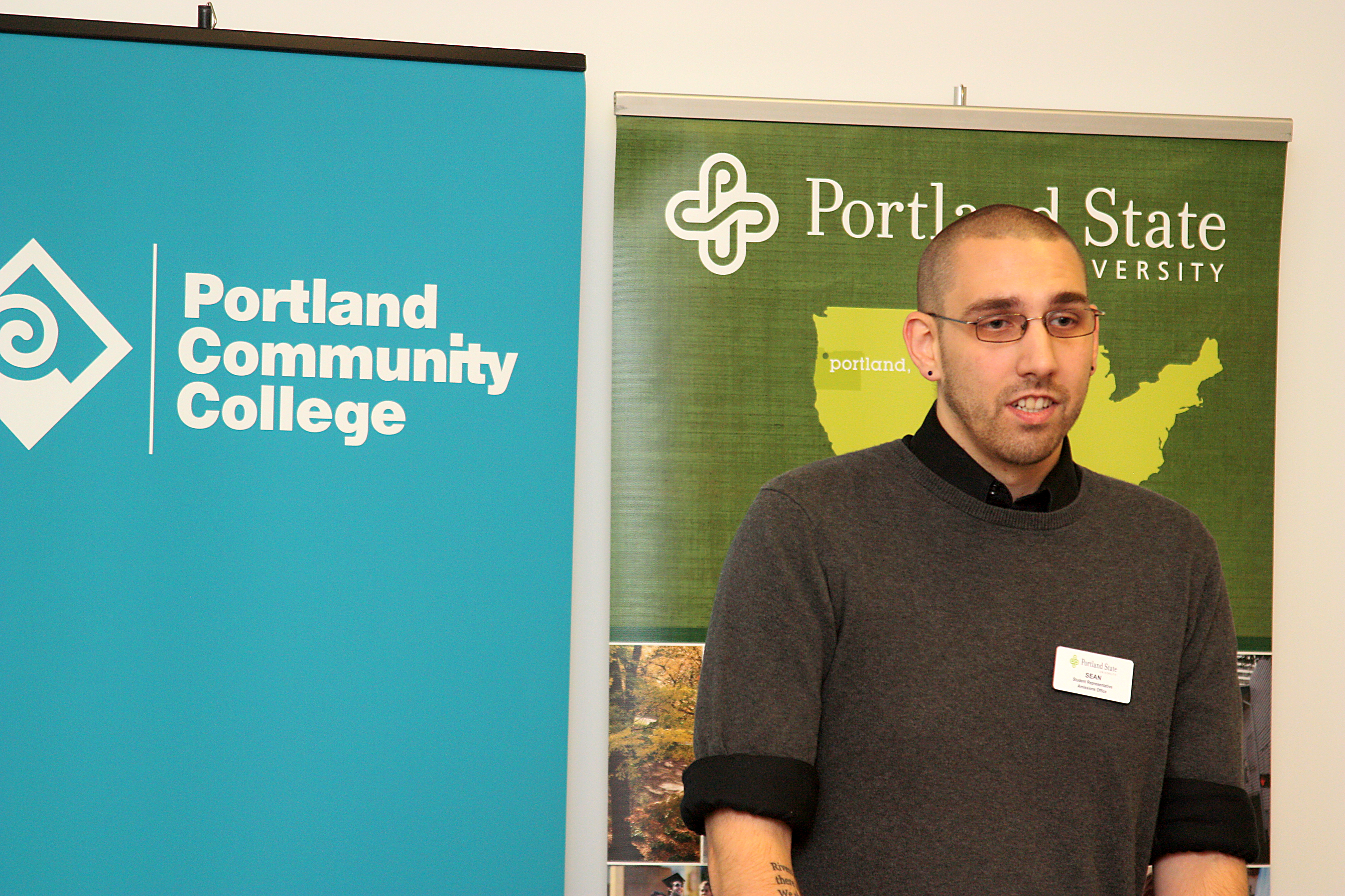 Representatives from the Oregon University System and Community College Workforce Development speak to the crowd.