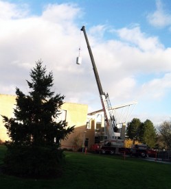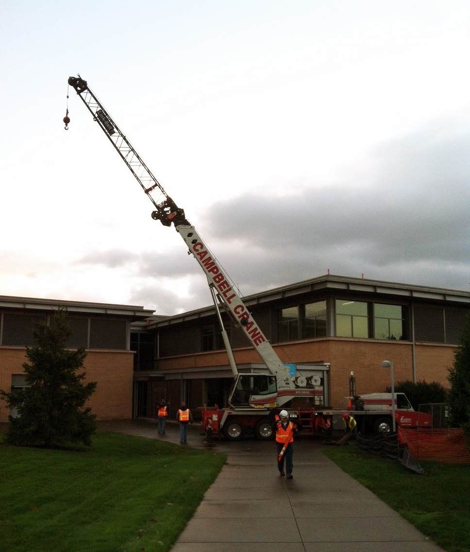 On a rainy Saturday – December 1, 2012 – crews with Fortis Construction placed three very large condensing units on the roof of Buildings 7 and 9 at Rock Creek Campus. Condensers are part of air conditioning units that will provide cooling to campus telecom rooms. This task was part of the VoIP (Voice over Internet Protocol) and generator work planned for Rock Creek.