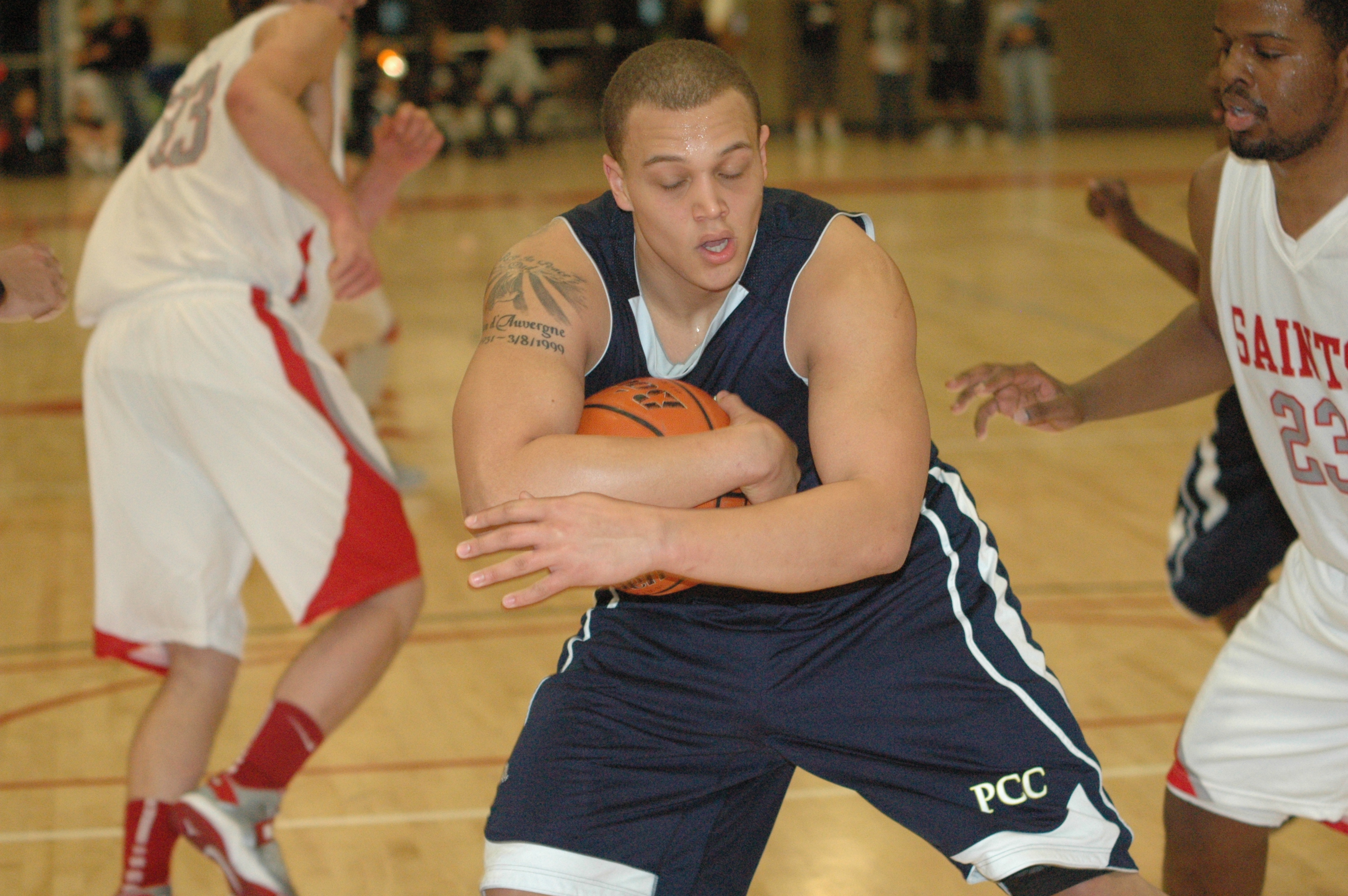 Portland CC’s Warren Edmondson (left) and Anthony Hines double-team Mt. Hood’s Blake Updike