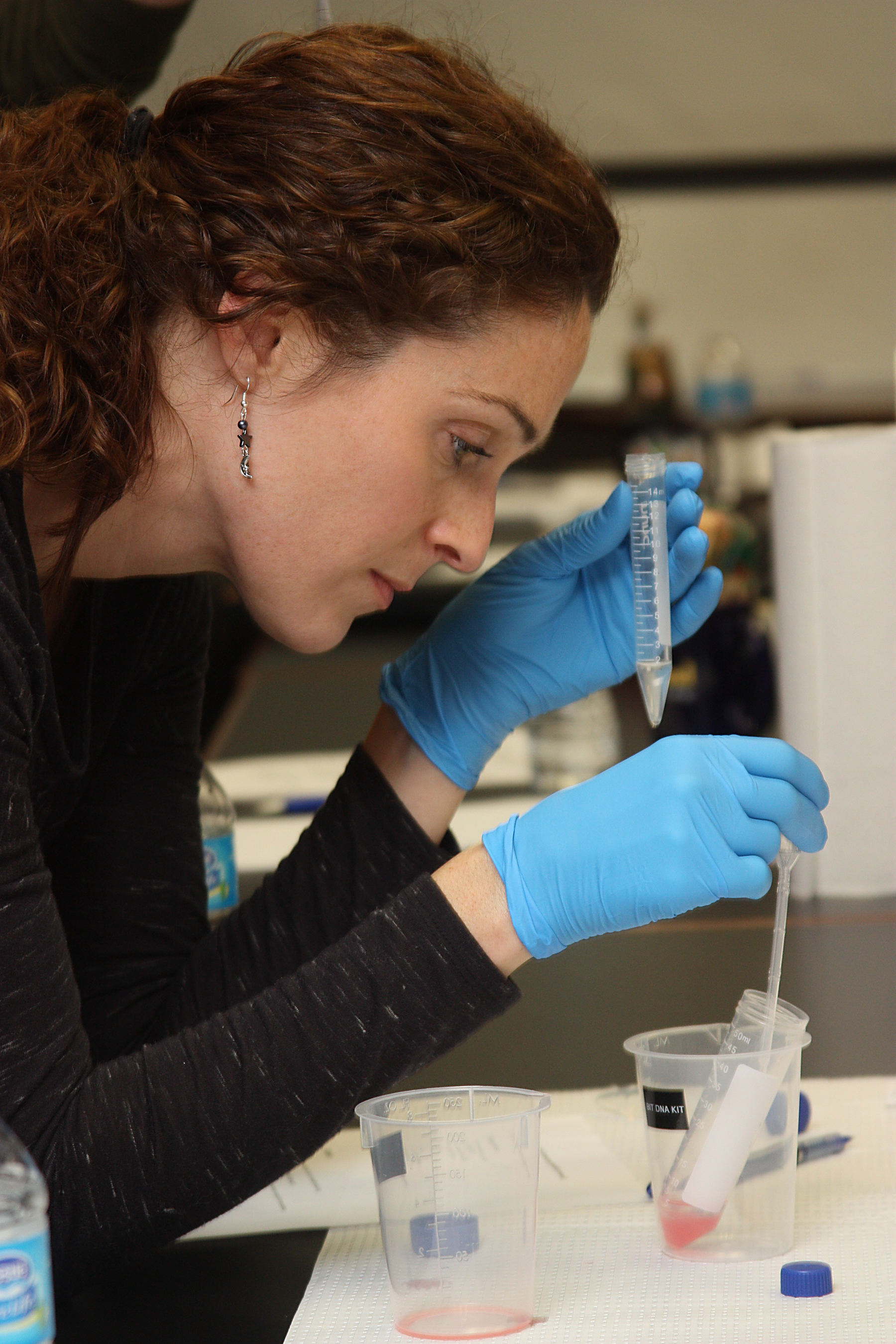 Naomi Allan of Welch Allyn extracts DNA from a strawberry during an advisory group meeting for the Bioscience Technology Program. The test helps the industry reps to see if it will work for students in a key class.