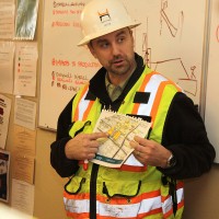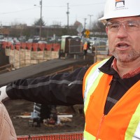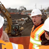 Derrick Beneville, project manager for Hoffman, discusses with the PCC students the kinds of jobs that are on the Cascade construction site. On the right, surveyor Darryl Ming of Ming Surveyors, Inc., scopes out the area.
