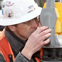 • Derrick Beneville, project manager for Hoffman, discusses with the PCC students the kinds of jobs that are on the Cascade construction site. On the right, surveyor Darryl Ming of Ming Surveyors, Inc., scopes out the area.