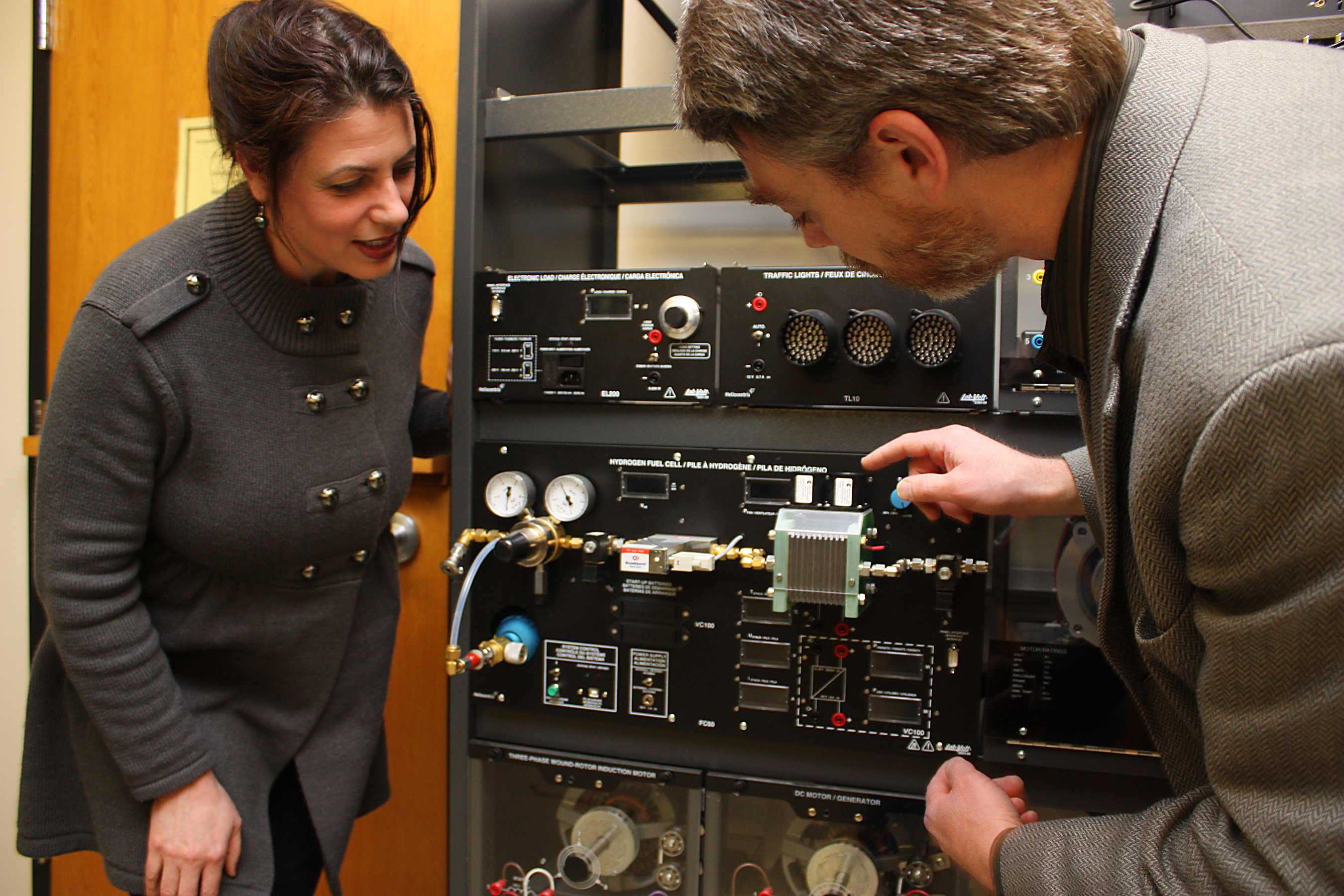 Electronic Engineering Technology Chair Sanda Williams and ClearEdge's Vice President of Engineering Tom Prevish inspect one of three Lab-Volt hydrogen fuel cell training systems that will be used for the new class.